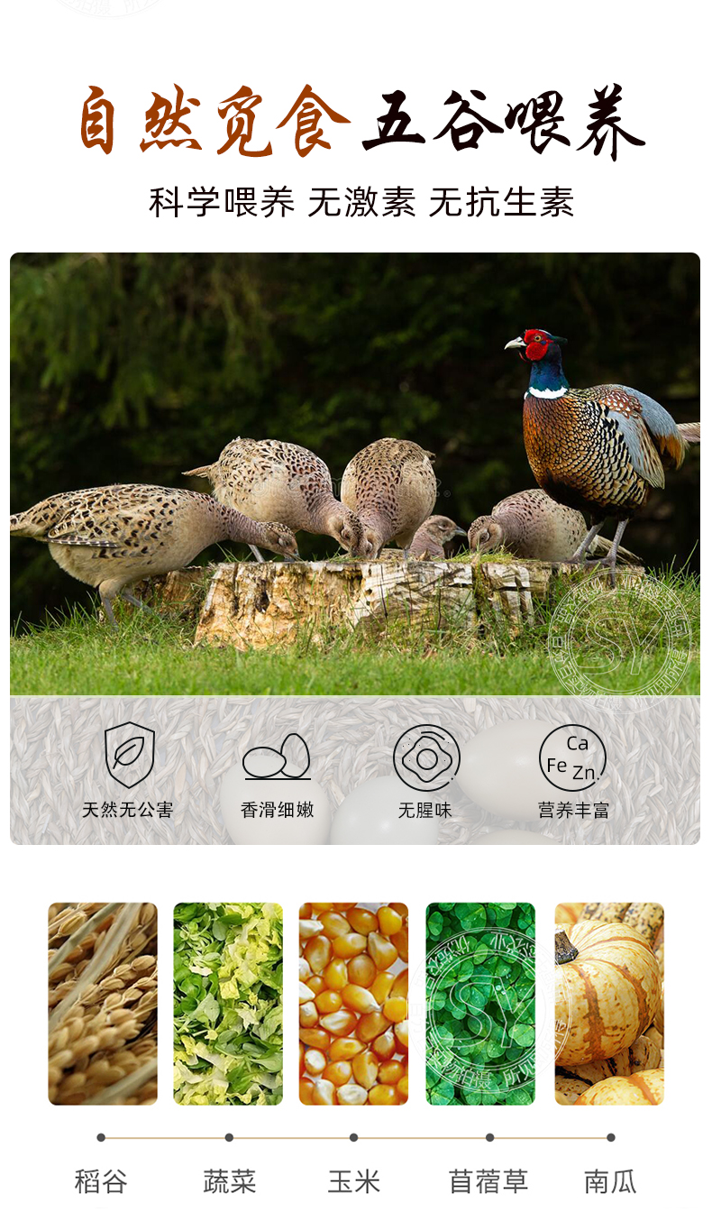 这款七彩山鸡蛋, 蛋壳硬,蛋黄大,呈桔黄色,蛋清稠、蛋白浓厚细嫩,富含大量卵磷脂、维生素A、B、E和锌、硒、碘微量元素等微量元素以及多种氨基酸。其含锌量是普通鸡蛋的5倍;硒是普通鸡蛋的5倍;碘是普通鸡蛋的3倍,氨基酸的含量比普通鸡蛋高出5-10倍,活性钙是普通鸡蛋的4倍,是一种富含高维生素、高微量元素、高氨基酸、低胆固醇、低脂肪的天然滋补食品,营养均衡合理,极易被人体消化吸收,尤其适合婴幼儿、孕产妇、身体虚弱者,经常食用山鸡蛋能促进脂肪转化、改善心脏和大脑功能,提高人体免疫力。