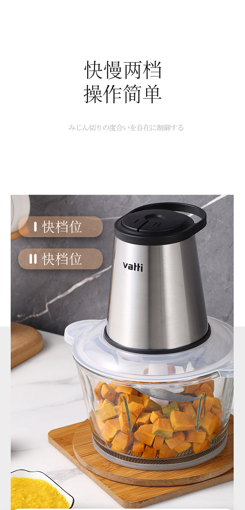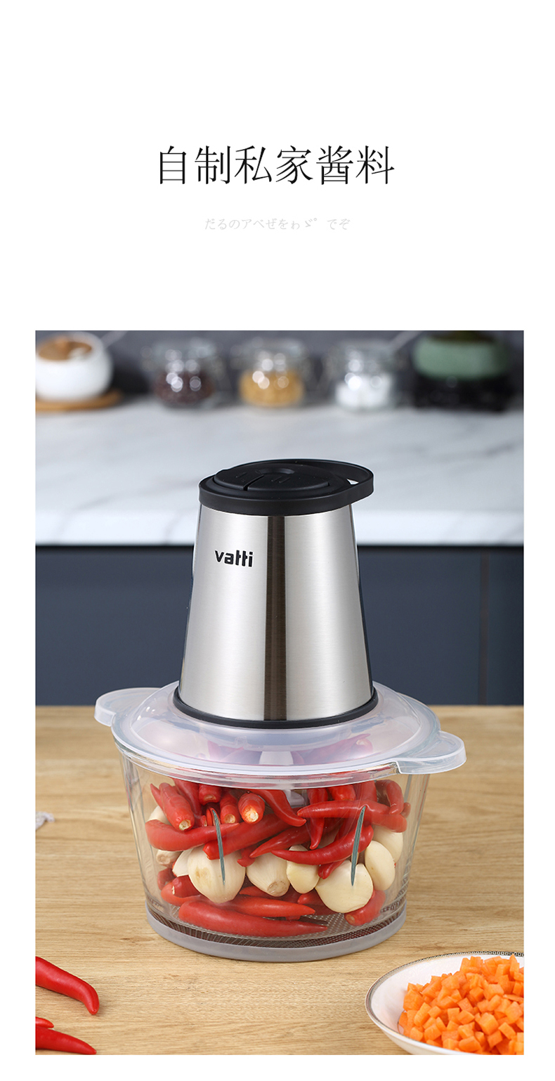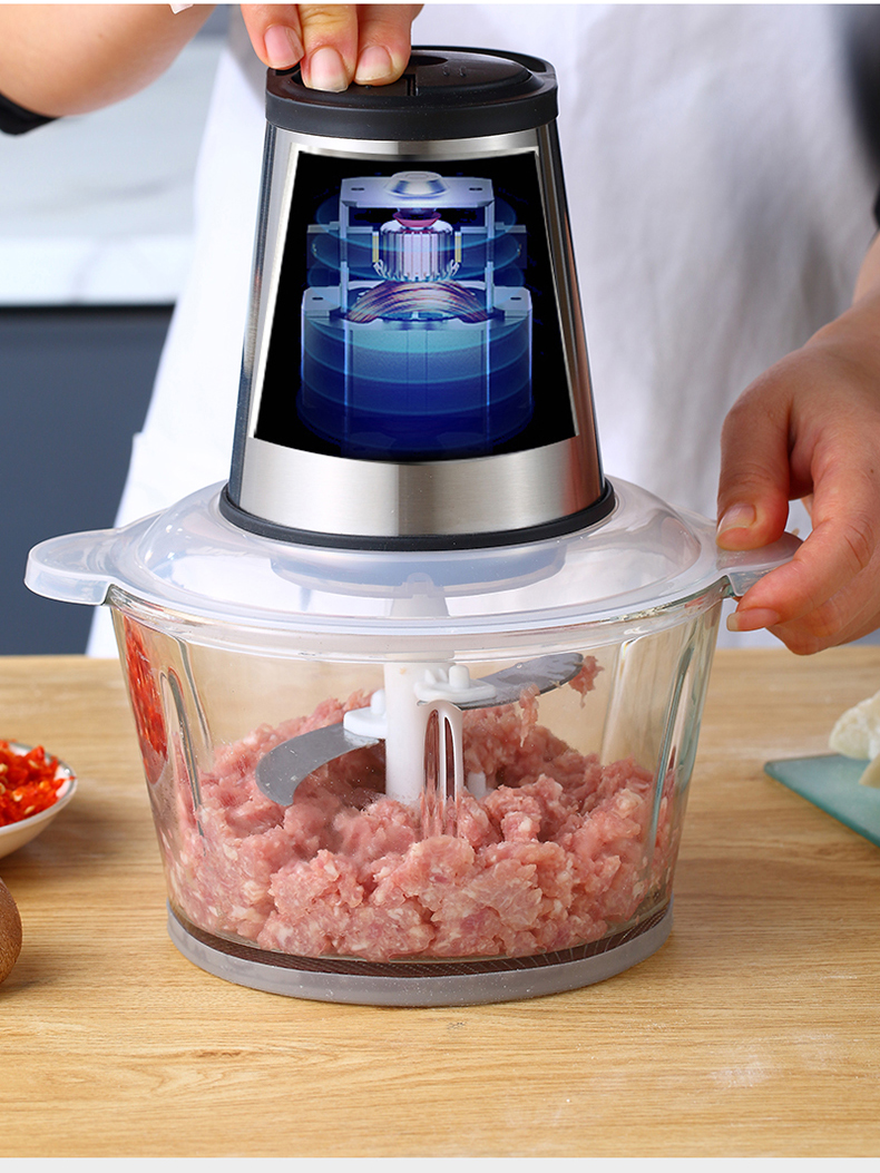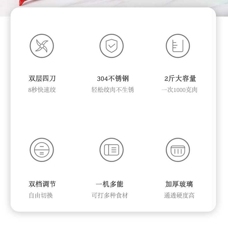 华帝绞肉机,绞肉、绞馅、剁辣椒一机多能,绞肉更快更有劲,双层四维刀片,两档调节,随心控制,不锈钢接口,安全可靠,大容量满足全家需求,加厚玻璃碗便于清洗,打肉只需30秒,料理达人必备~