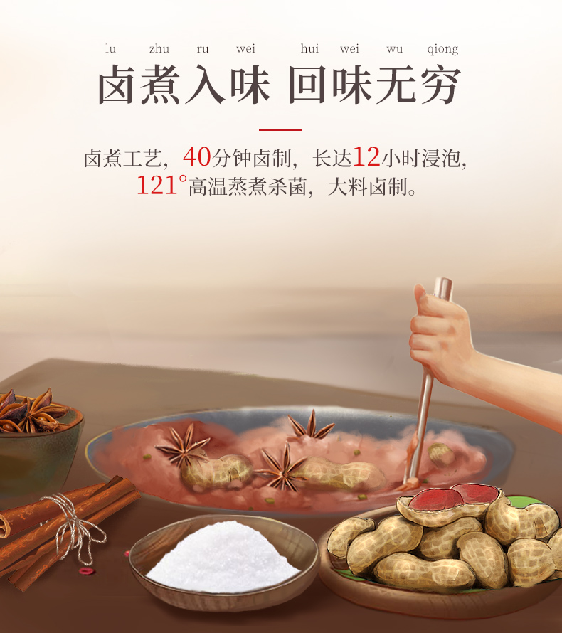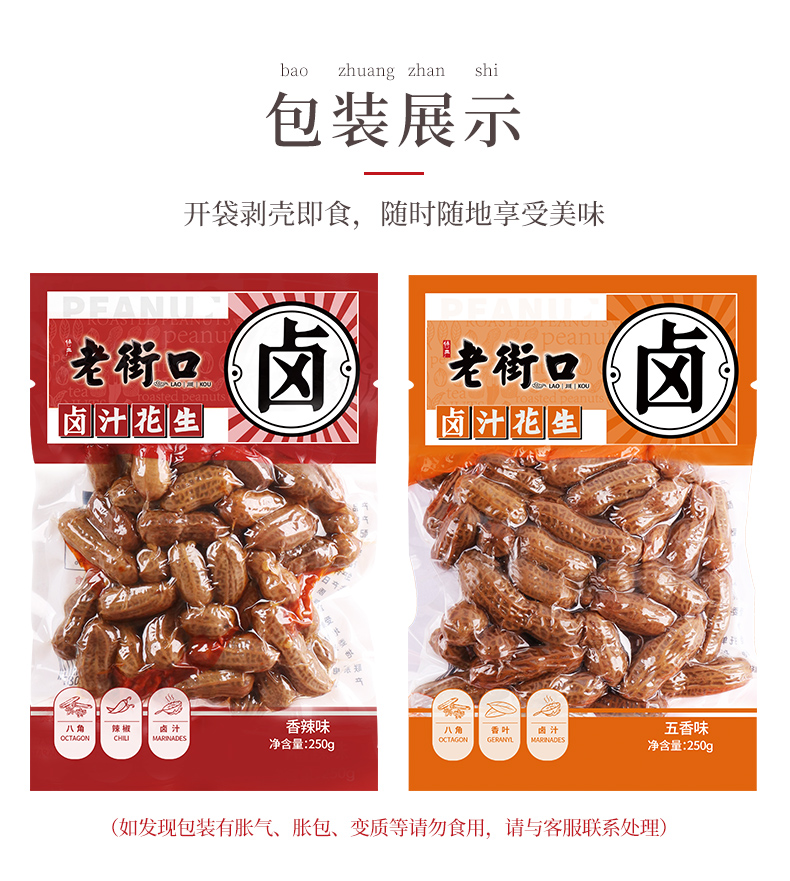 老街口 卤汁花生,精选新鲜带壳花生,大小均匀,清洗干净,匠心煮制,汁香入味,有香辣、五香2种口味,不添加防腐剂,真空锁鲜包装。