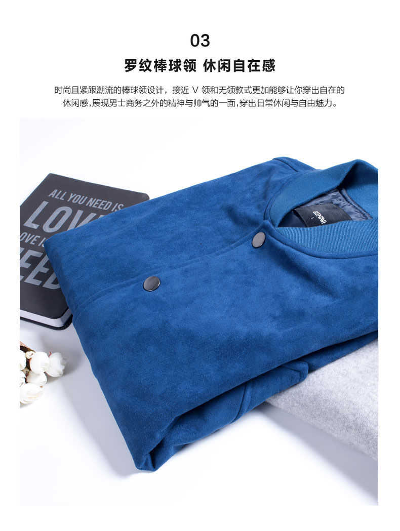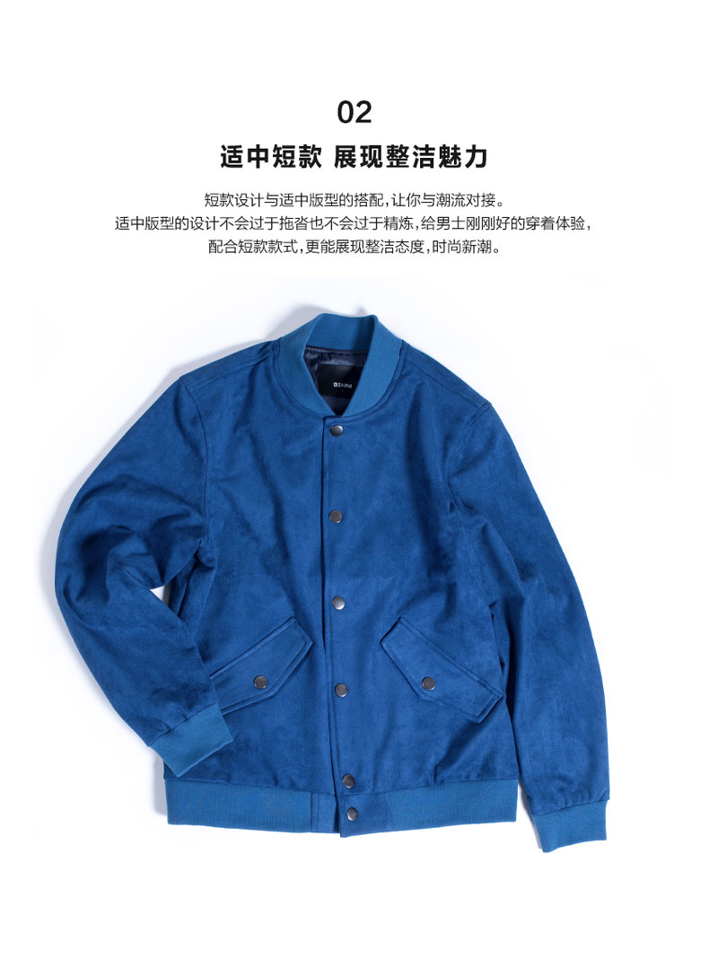 本米棒球夹克,款式上综合了校服夹克、牛仔夹克等几种类型夹克,适合30-40岁有一定社会阅历人群穿着。门襟按扣设计,比常见的拉链款多了休闲感,主色采用与牛仔夹克相似的宝蓝色,显得人年轻,却并不像牛仔夹克一样过分浮夸。短款设计,适中版型,干净利落好搭配。
