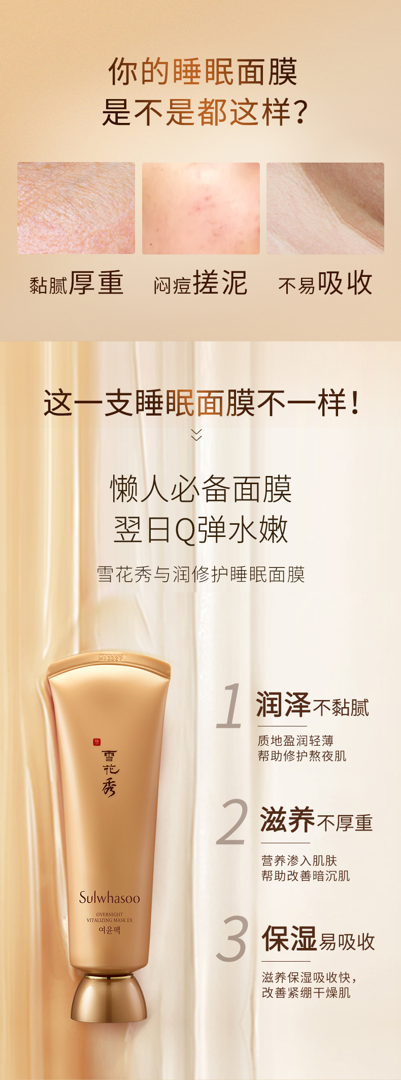 这款Sulwhasoo雪花秀与润夜间修复面膜,是雪花秀的明星产品,选用芍药、莲子、百合等五种草本植物成分,能够在夜间深度修护滋养肌肤,仅需在睡前涂上一层,早上的时候就能恢复肌肤水嫩润泽,同时也可作为熬夜急救面膜,能明显改善气色并抑制熬夜引发的痘痘等。