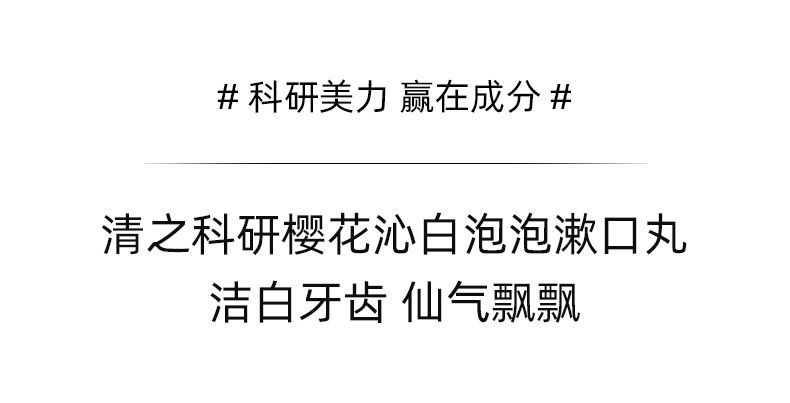 清之科研创立于2020年,属英国联合利华集团入孵的高端口腔美护品牌。泡泡漱口丸是「清之科研」独家开发的产品,只需要放在口里咀嚼就可以自动起苏打泡泡,在不方便刷牙的时候使用,可以去除残留在牙齿上面的食物造成的即时性的色沉,还有清新口气的功效,可以说比漱口水强力,但是又解决了牙刷在户外不方便携带的情况。