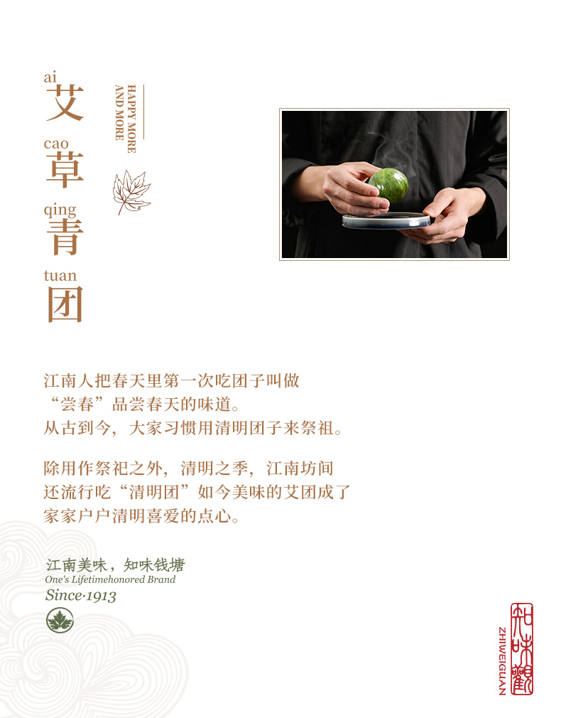 知味观是杭州的百年老字号酒家,“知味停车,闻香下马 。欲知我味,观料便知。” 老店坐落在西子湖边,名气响当当。知味观的青团,是所有青团里艾草味最浓的,饼皮里可以看到艾草丝丝。个头很大,单个就有80G,差不多和两鸡蛋一样大。杭州百年老字号 知味观 艾草青团 420g 图1杭州百年老字号 知味观 艾草青团 420g 图2杭州百年老字号 知味观 艾草青团 420g 图3