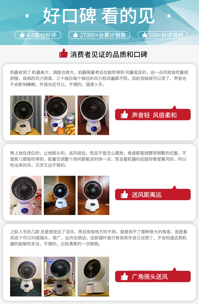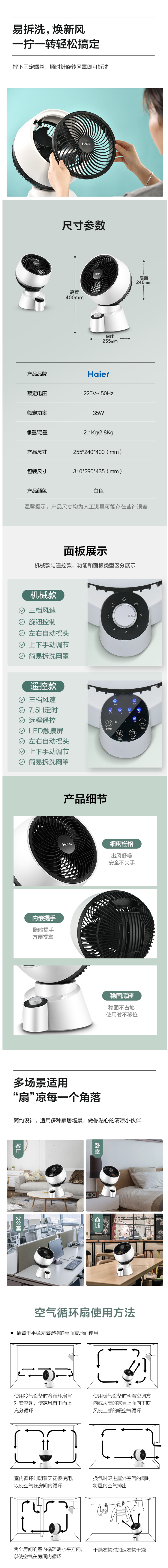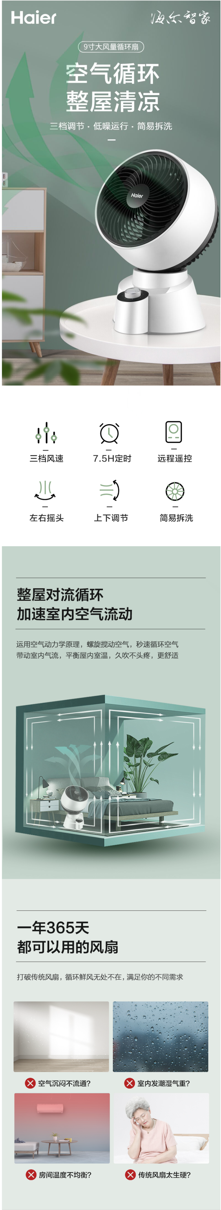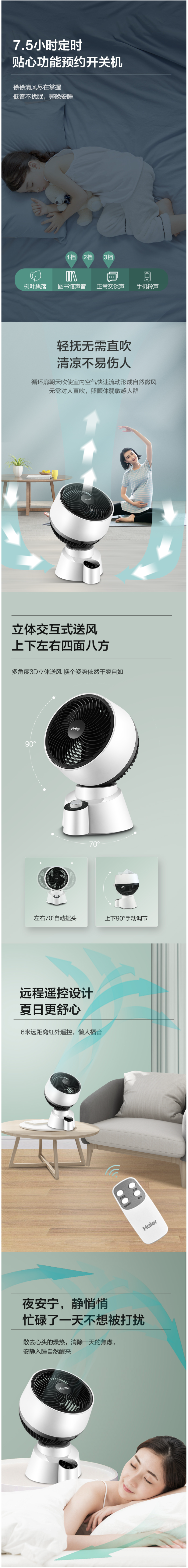 这款海尔空气循环扇,能上下左右广角送风,可以使得室内空气,循环流动起来,把底部的冷气,往上吹;旋涡气流,出风量大,风感细密绵柔,不吹人;可配合空调、取暖器和空气净化器使用。支持50㎡的空间内使用,用于大部分家庭的客厅和卧室完全没问题。
