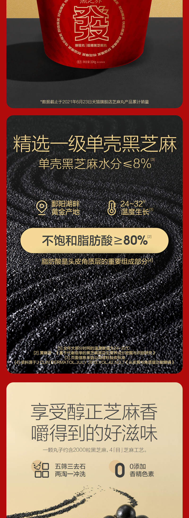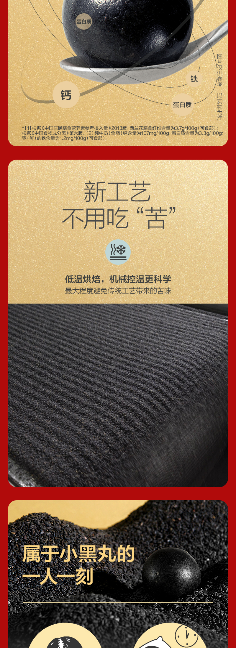 这款五谷磨房 黑芝麻丸,精选鄱阳湖黄金产地一级单壳黑芝麻、还有黑豆、黑藜麦、奇亚籽、黑米、黑藜麦等新鲜原材料,经过五筛三去石、两淘一冲洗步骤,严格筛选,特殊四目工艺成品黑芝麻丸口感有嚼劲、绵软充实,柔润细腻,没有添加白砂糖、麦芽糖、甜味剂,只选用了低聚异麦芽糖,保证纯正健康。