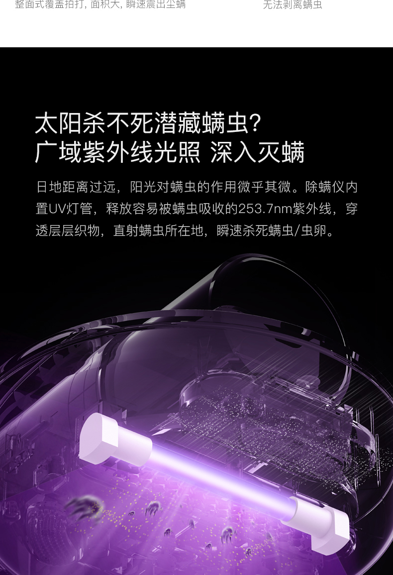 每分钟8000次专利拍打装置、12000Pa大吸力,在配合紫外线灯管既可以有效除螨,专利收尘装置,过滤排出清洁空气,避免二次污染;杀菌除螨率达到大于99.9%。