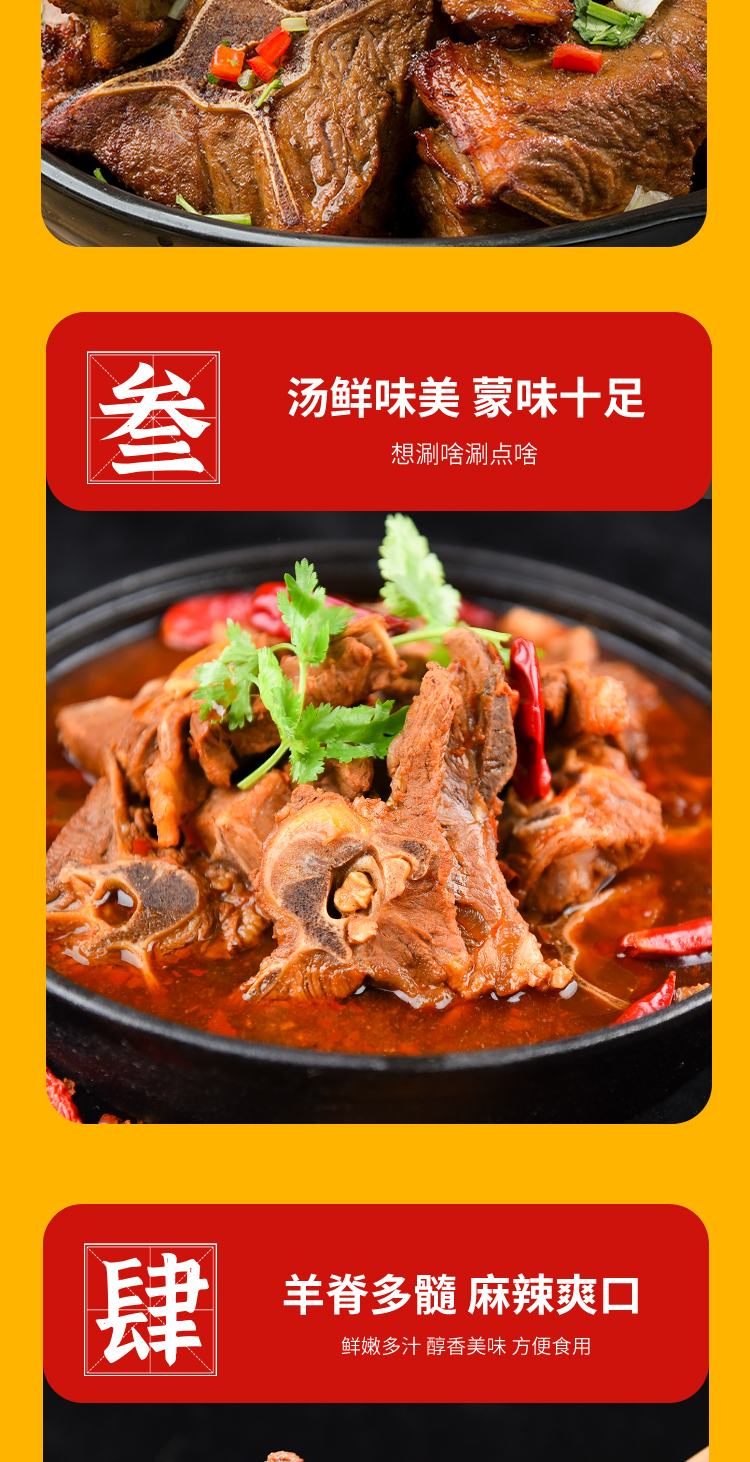 甄选内蒙六月龄羔羊羊蝎子,大厨精心调制,羊脊多髓,肉质鲜嫩,味道醇香、麻辣爽口,加热即食,非常方便。