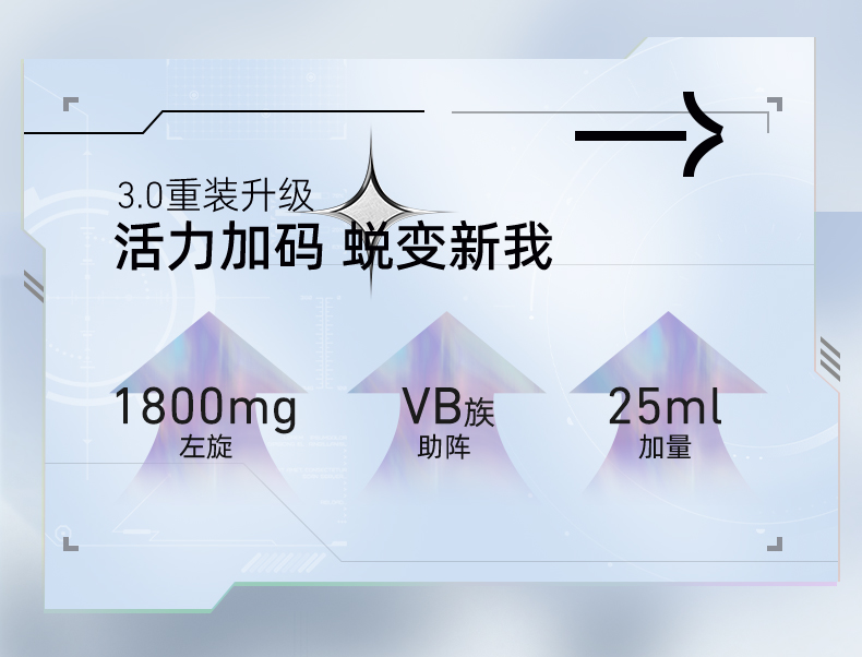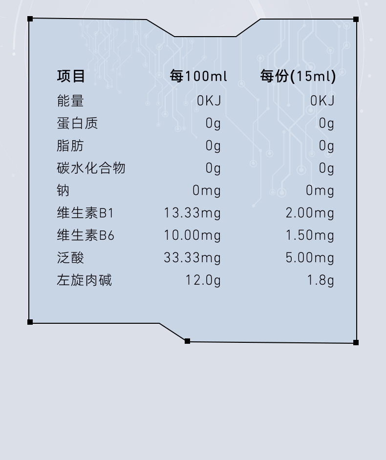 每10ml含有1200mg左旋肉碱,纯度高达99.99%,同时人体的吸收率也达99%,0糖分,0热量,0咖啡因。维生素B族协助脂肪在线粒体中分解燃烧;柑桔提取物能加速代谢,深层瓦解顽固部分,有效抑制食欲,预防能量过剩。