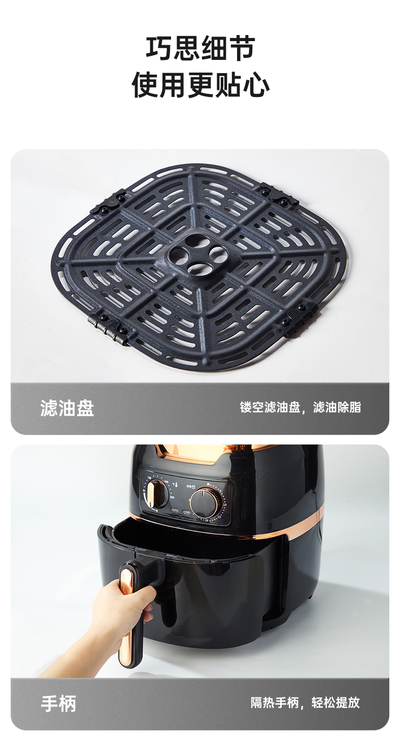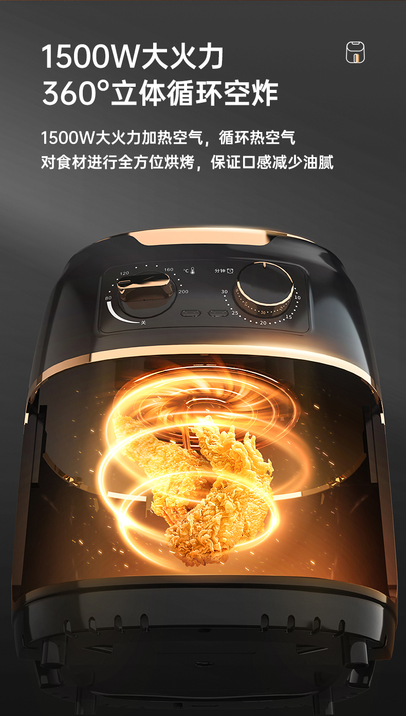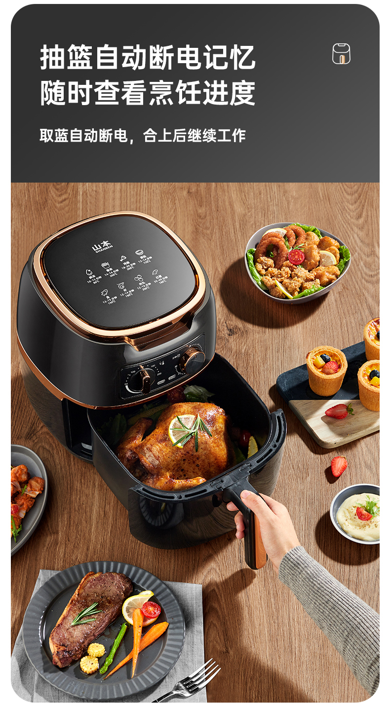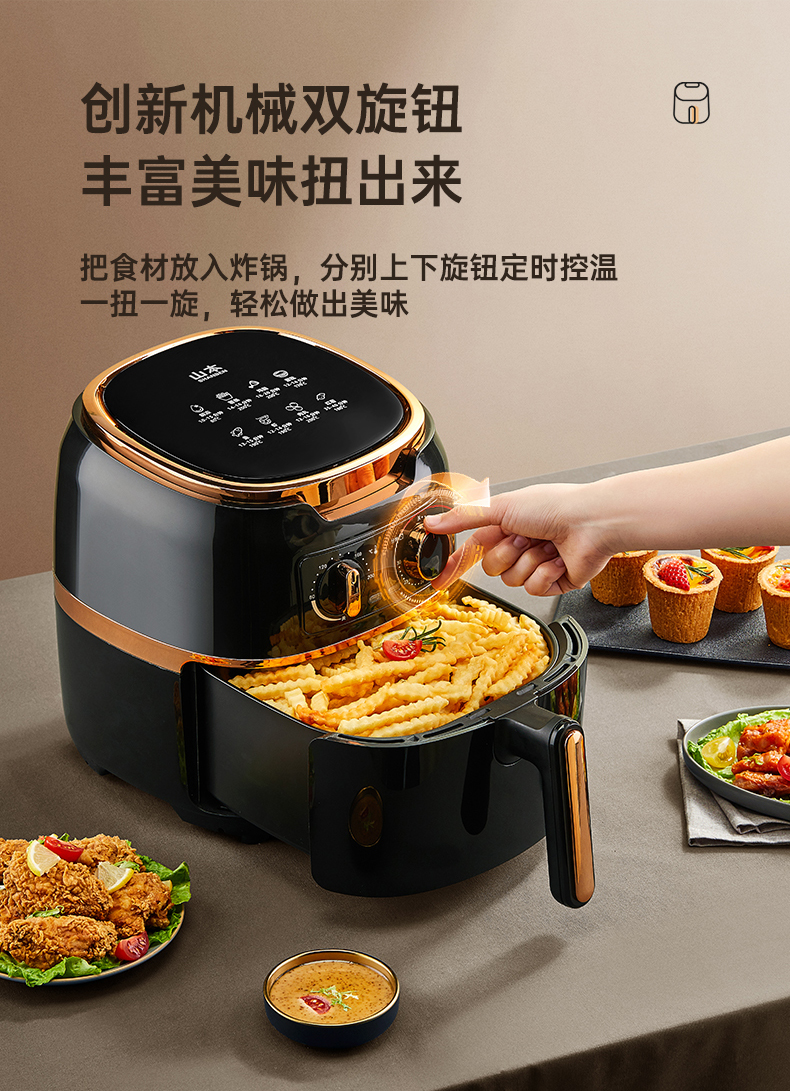 这款山本 S-2108TS空气炸锅,1500W大火力,4.5L大容量,抽桶即断电,可以随时添料尝味或放入食物续炸,放入炸篮自动原状态运行;双旋钮设计,分别控时控温。