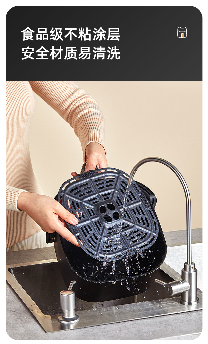 内腔是一体式设计,有不粘油涂层,炸篮和炸锅运用分离技术,按下释放按钮,轻松分离炸蓝和锅底,不粘油更易清洗;锅内容量是4.5L,能满足8-10人可用。