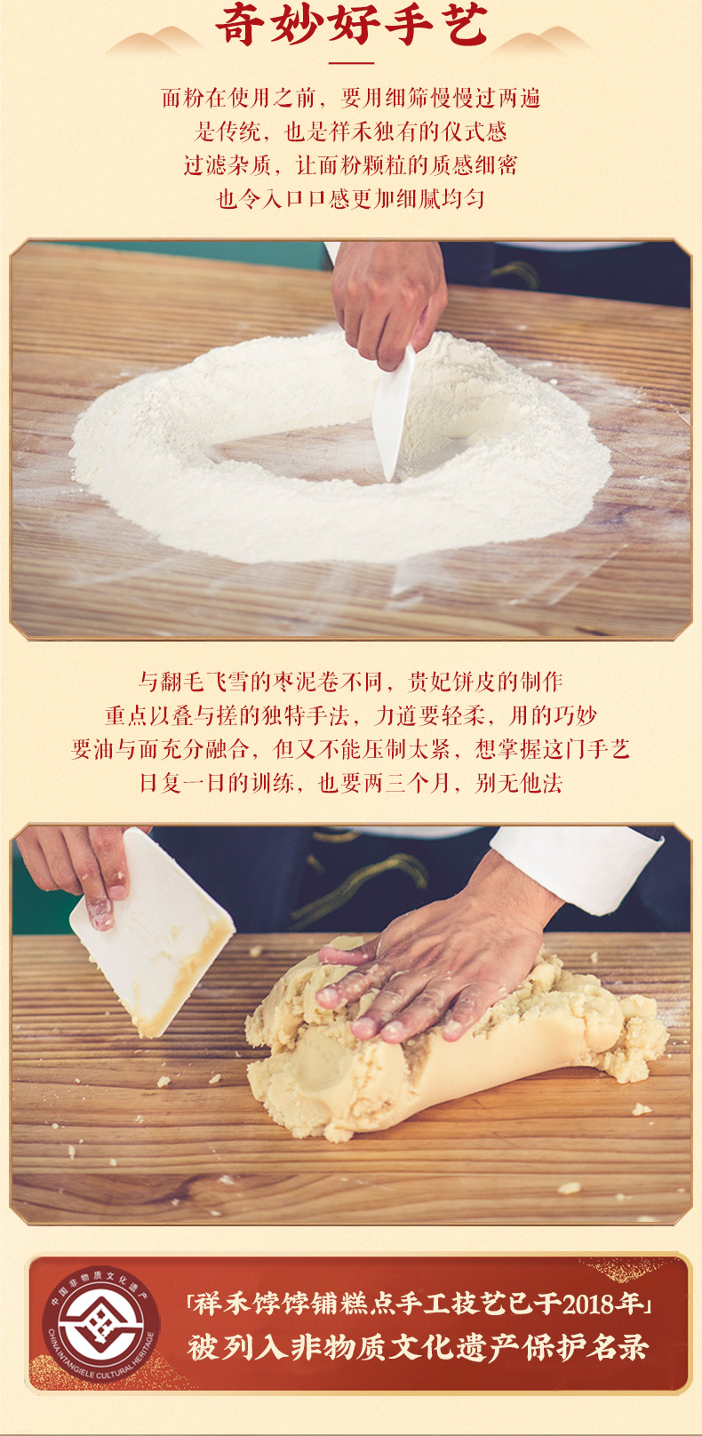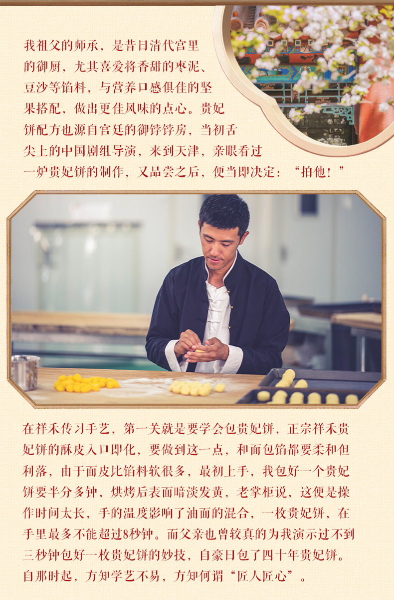 这份贵妃饼有经典地道的枣泥核桃、甜口暖心的玫瑰豆沙小红莓,以及创新口味的山楂甜莓这3款馅料选择。枣泥核桃的贵妃饼,是镇店之宝,所有到店里的人,定要尝这一口。它使用6枚正宗沧州金丝小枣精心炒制而成的,里边的核桃仁也只选用当年的新鲜核桃,通过手工剥壳制作,确保新鲜,嚼起来饱满香脆。贵妃饼上的红点花饰也是由自然的红曲米精制而来的色素,确保每一口都是鲜香、健康、放心和安全。祥禾还在古籍配方的基础上进行了降油、降糖改良,譬如面皮起酥不再使用猪油,多次改良后形成植物奶油与进口黄油的形式。这样的起酥油没有反式脂肪酸,让皮酥细腻,淡淡奶香,一咬下去,扑簌簌如雪珠下落。而降糖后,也让贵妃饼清甜不腻,酥软过后是满口的花果香。色泽乳白的外层酥皮,采用传统手法揉捏,层次分明,酥脆松软,一口掉渣再咬一小口枣泥,真实的枣香和桃仁儿的清香缠绕,吃过之后,唇齿间还能感受到沙软鲜甜,酥腴清香,仿佛让人也回到了那些心平气和的老时光里。
