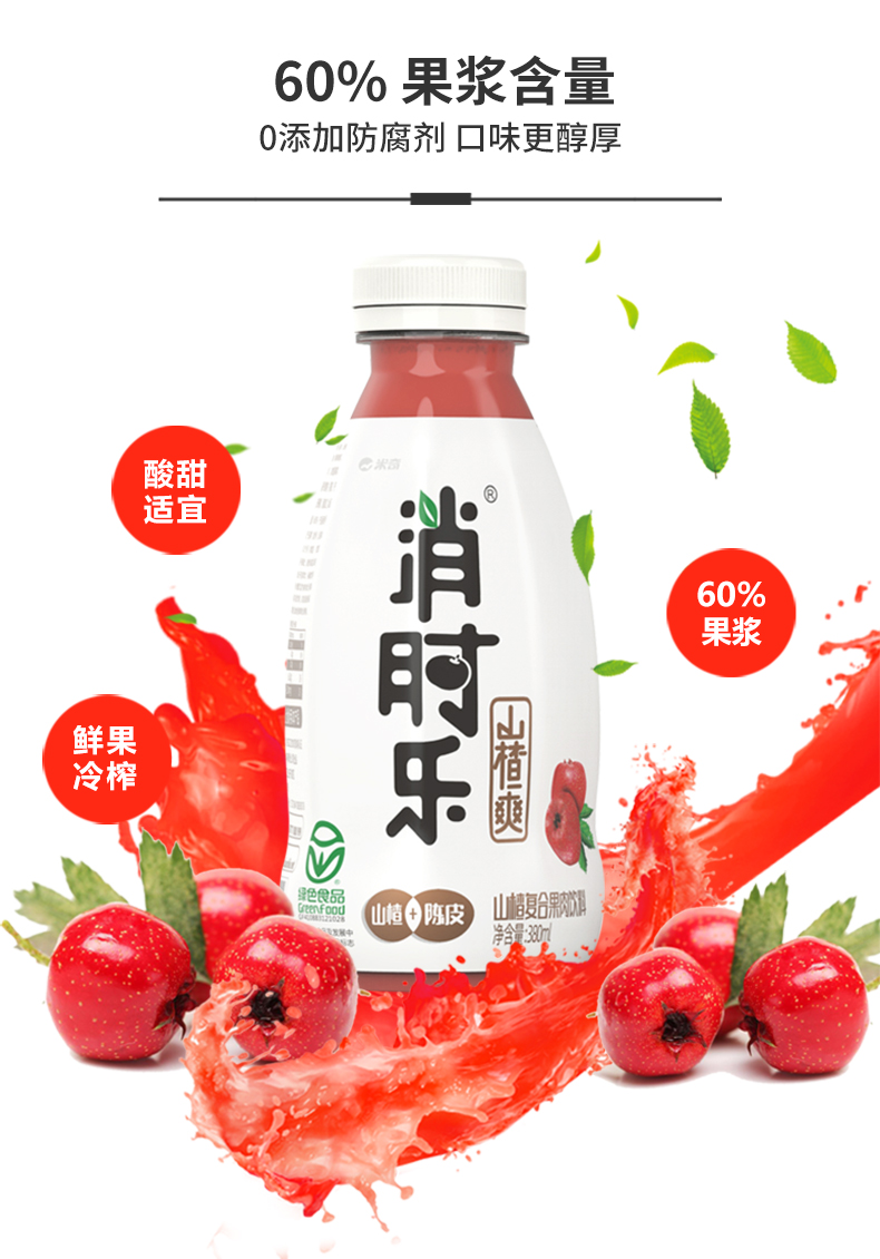 这款消时乐野生山楂汁,使用南太行山的野生山楂为原料,山楂果浆含量60%以上,有果汁和果肉,0色素、0防腐剂,口感纯正爽滑,酸甜适中,山楂有开胃健脾、消食化积解油腻的功效。