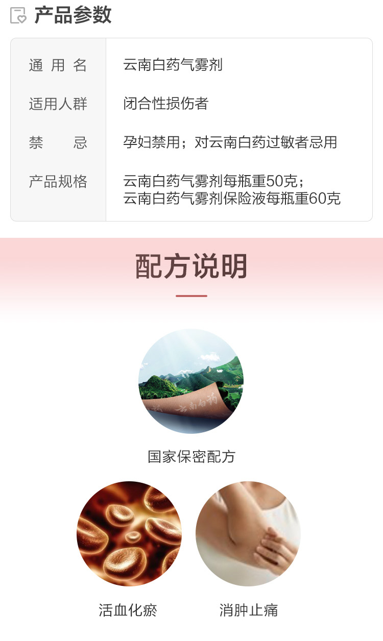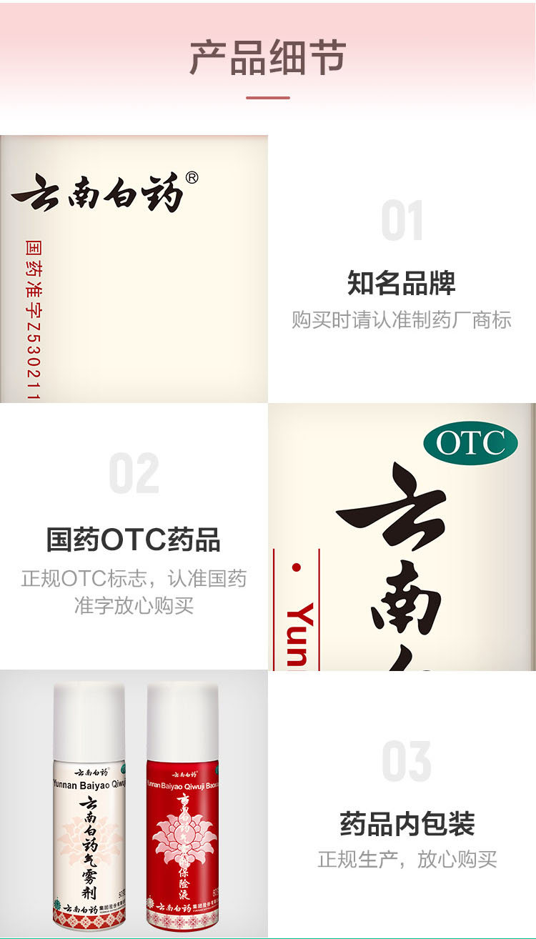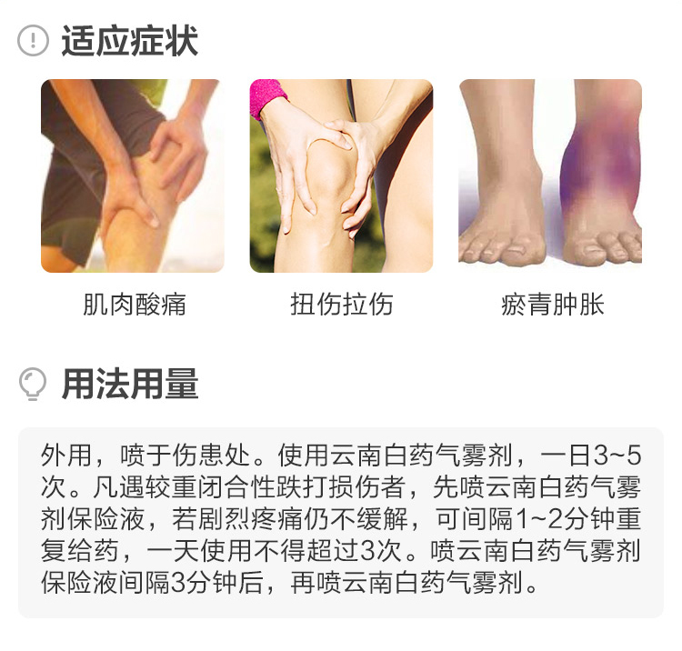 云南白药喷雾是国药OTC产品,使用国家保密配方,主治活血散瘀、消肿止痛、肌肉酸痛、风湿疼痛等症状。