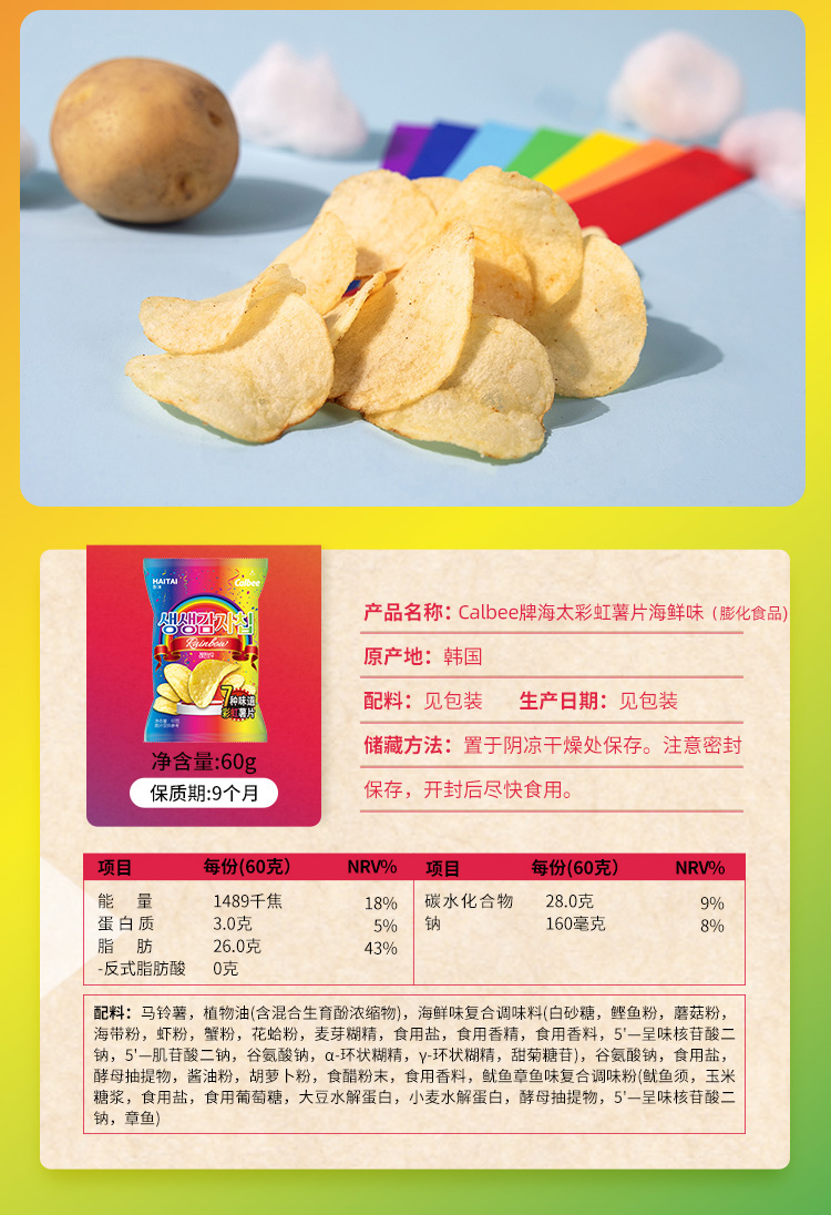 天猫Calbee官方旗舰店79元,可领10元优惠券,实付69元到手。这款卡乐比 海太 蜂蜜黄油薯片,精选上等的优质土豆,整只土豆采用水切方法,保持了土豆的完整和脆薄度,每片都被香浓的蜂蜜和黄油覆裹,甜香融合,甜而不腻。卡乐比 海太 彩虹薯片 海鲜口味,融合7种口味,精选上等的优质土豆,整只土豆采用水切方法,保持了土豆的完整和脆薄度。