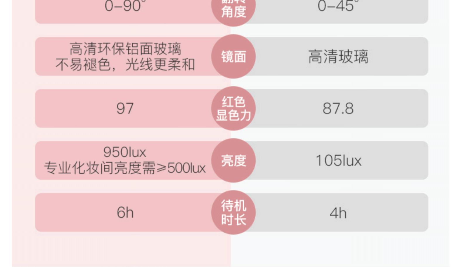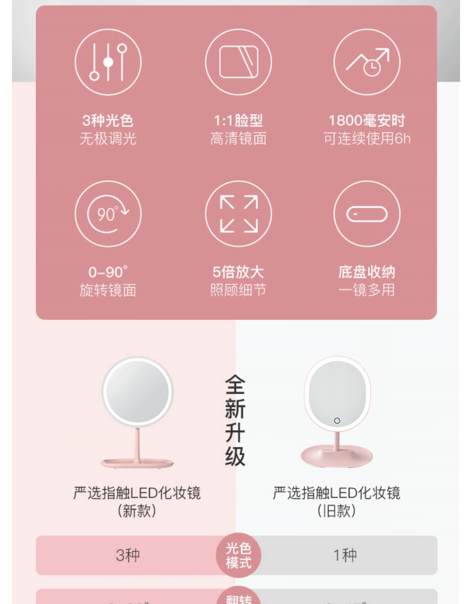 这款网易严选指触LED子母化妆镜,采用分离设计主镜1:1比例还原真实比例,背后拥有可拆卸手持5倍放大化妆镜,满足不同的使用需求。正面还配有触控按键,一键点亮3种亮度,并且能够通过长按调节明亮,使用耐用型LED灯珠,柔光不伤眼并且为化妆提供良好的光照环境,1800毫安持久续航,照亮你的美。镜面可90°翻转,同时底座还配有收纳槽,方便收纳物品。