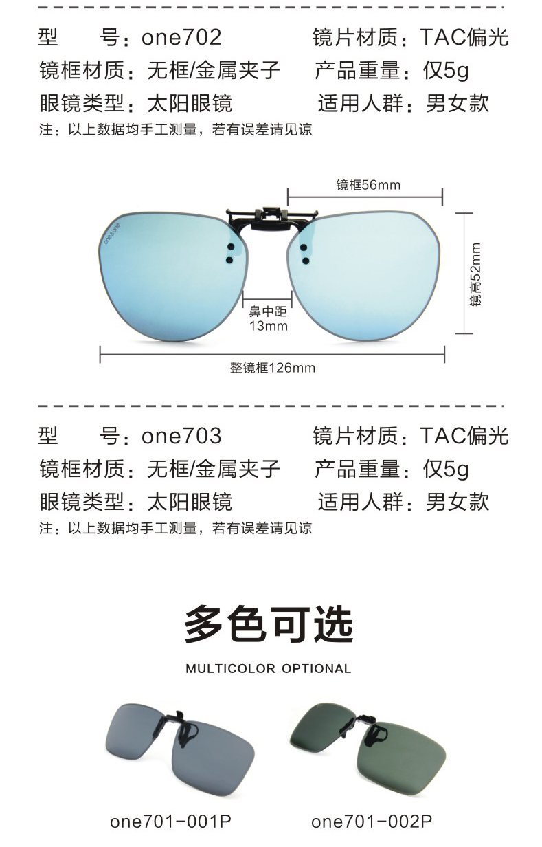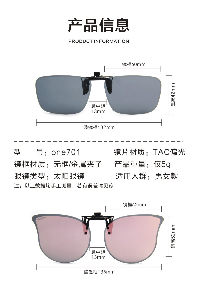 这款One&One近视专用偏光墨镜夹片,近视驾驶专用,5克超轻,戴上脸后无压力。升级金属合金架子,强度更好更牢固。