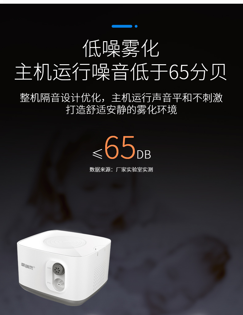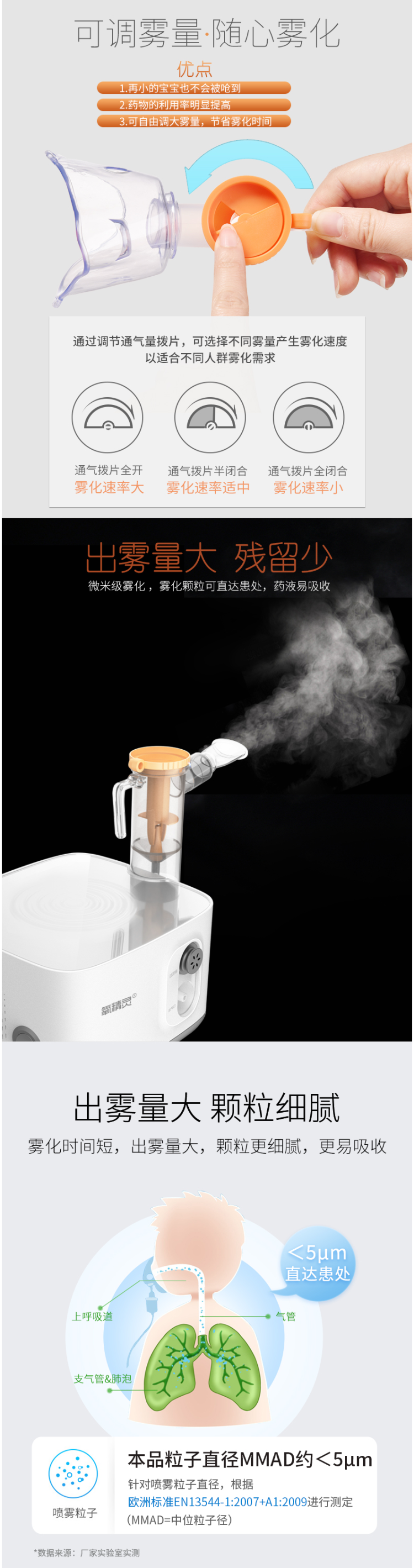 可通过调节同气量拨片,实现雾化速率的调控,以适应不同人群的需求,再小的宝宝也不会被呛到,有效提升药物吸收率;静音设计,音量低于65分贝;大格栅散热系统,充分散发热量,使机器远转的时间更长。