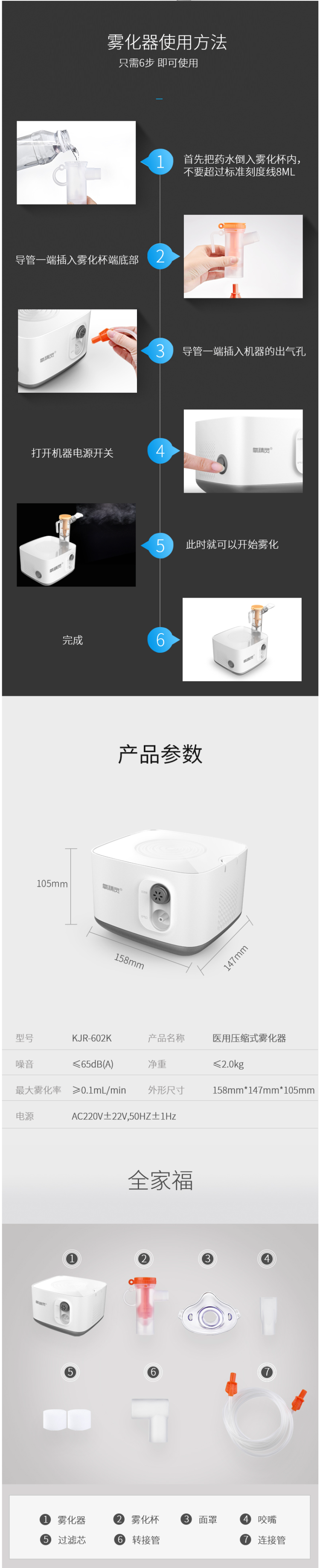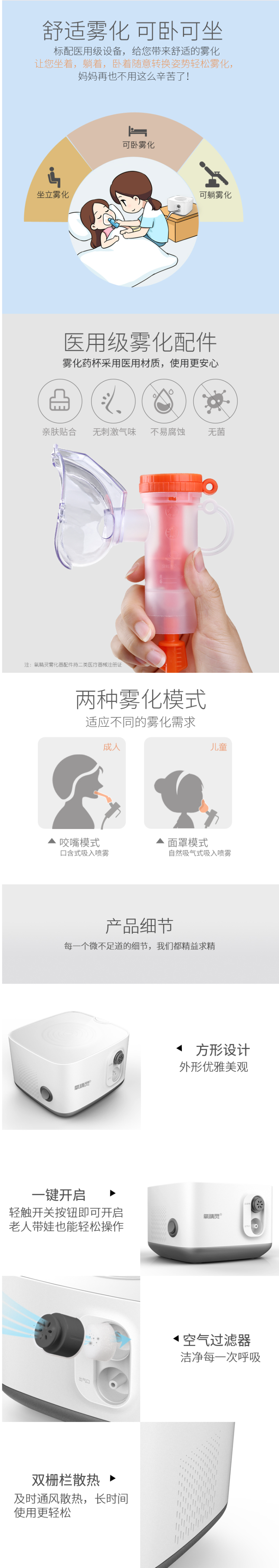 压缩泵大压强1.5标准大气压,雾化状微粒令雾化过程如呼吸般自然,直达上呼吸道、气管、肺泡以及下呼吸道患处,使人体更容易的吸收药液。