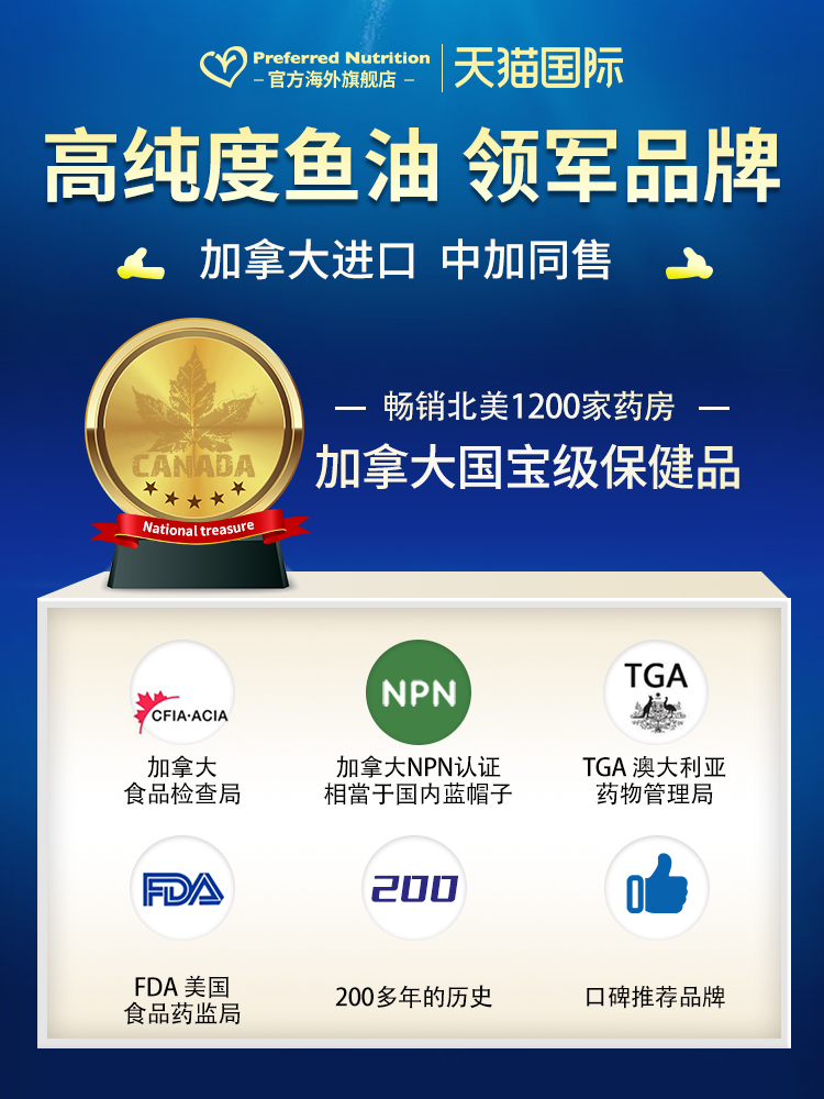 这款Preferred Nutrition深海鱼油软胶囊,加拿大进口,鱼油来源于加拿大纯净海域的野生小型深海鱼,浓度高、效果好,0污染,0重金属,含丰富的EPA及DHA不饱和脂肪酸,能在血液中迅速的被吸收,促进血液流通,减低血液在血管中的凝结及血管壁的黏附,从而有助于心脏和血管系统功能的正常运作,呵护心脑血管,预防三高。