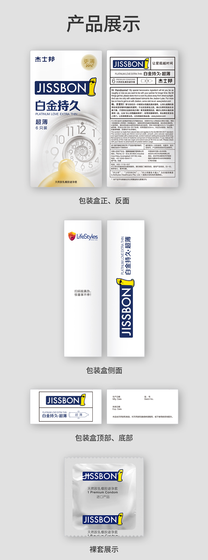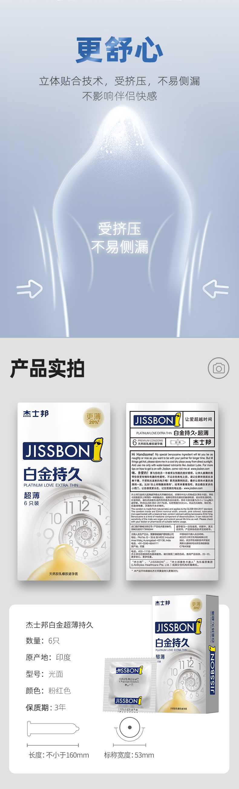 白金持久是 杰士邦持久系列的超薄款,也是口碑销量榜首,与黄金持久都是添加的9mg液态苯佐卡因,快速吸收、高效延时,集中于套套前端,局部降敏不影响整体快感。薄度上白金持久更具有优势,相比黄金持久要更薄20%,体感效果更棒。