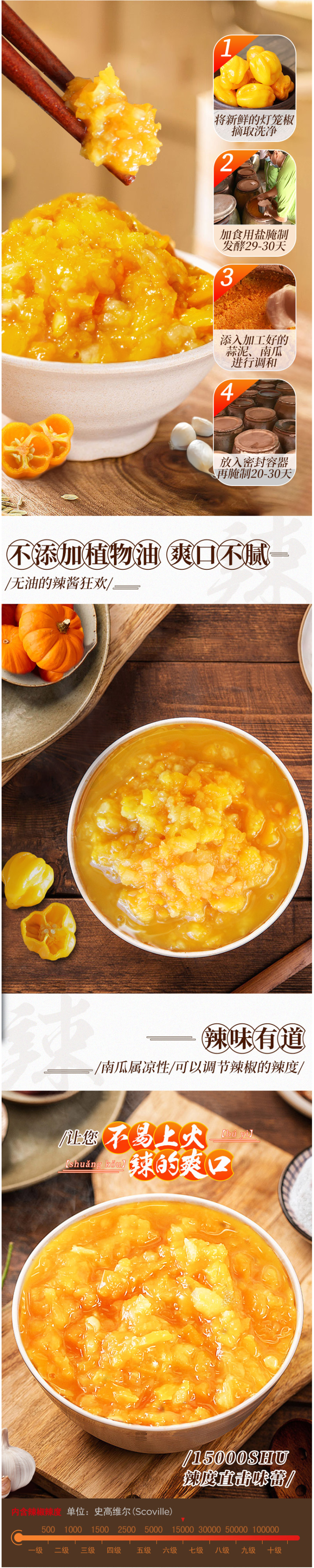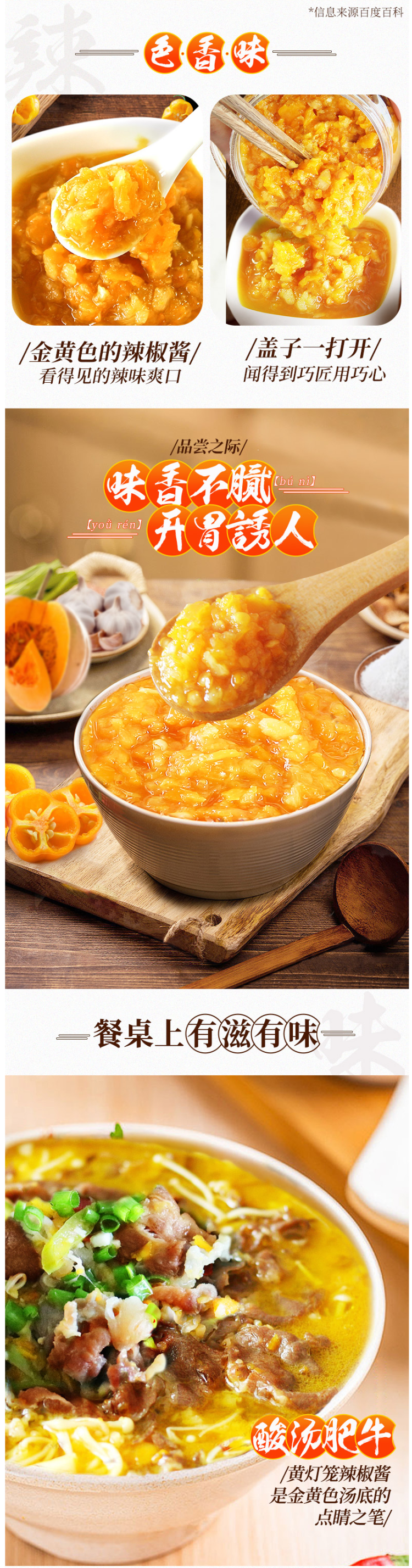 小编还是很喜欢灯笼辣椒酱,做酸汤牛肉必备的灵魂调料!灯笼酱后味很辣辣,但是可能是灯笼椒本身自带果脆,或者是配料中的南瓜中和了辣味,初入口有微甜,味道香醇,没有普通辣椒的呛辣,吃了还想吃。