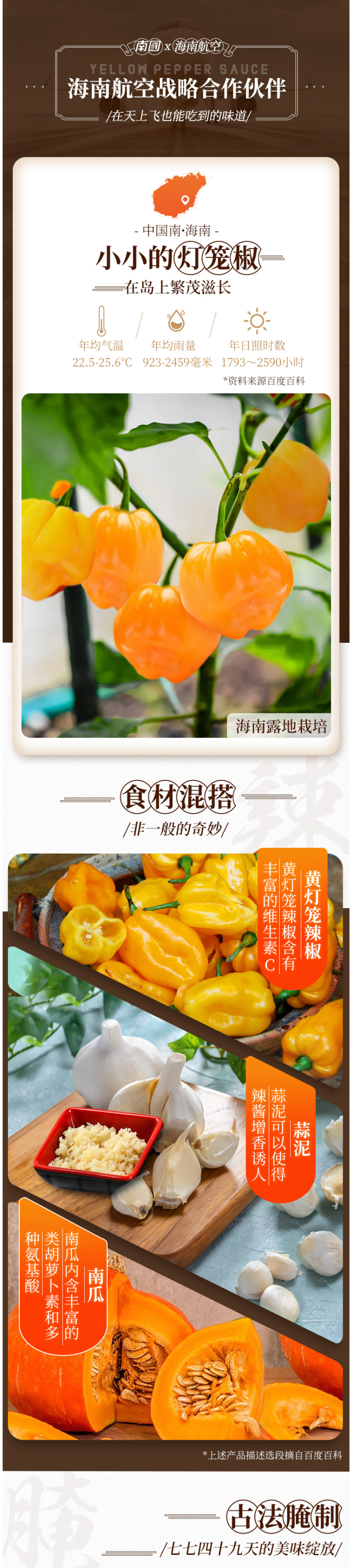 黄灯笼辣椒属于海南的辣椒之王,辣度比较高,含有维生素C、南国是海南的老品牌,以海南独有的物产等生产食品,以独特的风味和纯净天然的品质,获得消费者和客户的好评,产品成为观光旅客的首选。