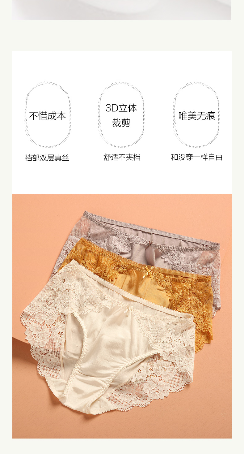 这款金三塔 女士100%桑蚕丝蕾丝无痕真丝内裤,采用100%桑蚕丝面料,与人体有极好的生物相容性,透气吸湿,亲肤顺滑,双面超舒感,裆部双层真丝,大面积蕾丝装饰,3D剪裁,舒适不勒不夹档,更显无痕质感。