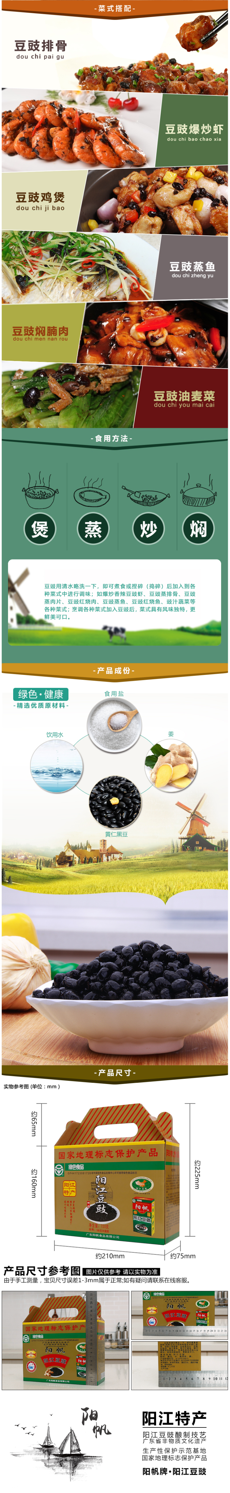 这款阳帆 黑豆豉,是用黑豆、水、食用盐、姜制成,纯手工无添加,原汁原味,豉味浓香,好吃不腻。豆豉用清水略洗一下,即可煮食或者捏碎(捣碎)后加入到各种菜市中进行调味。