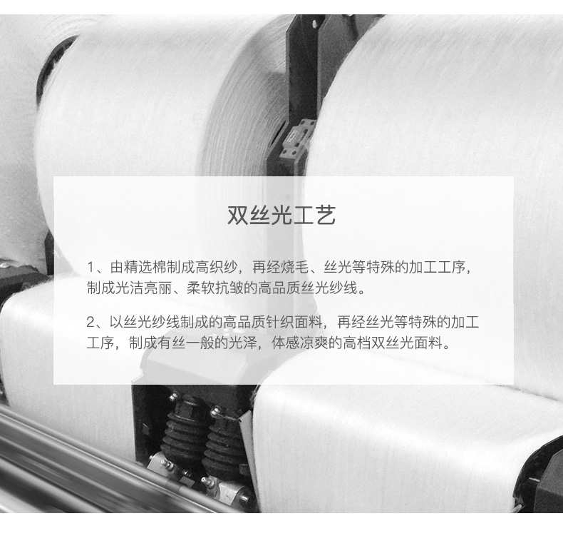 丝光棉有:纱线丝光「只将棉纱线丝光处理」、织物丝光「只将坯布丝光处理」、双丝光「就是前面两种都来一次」三种,以双丝光面料最好。