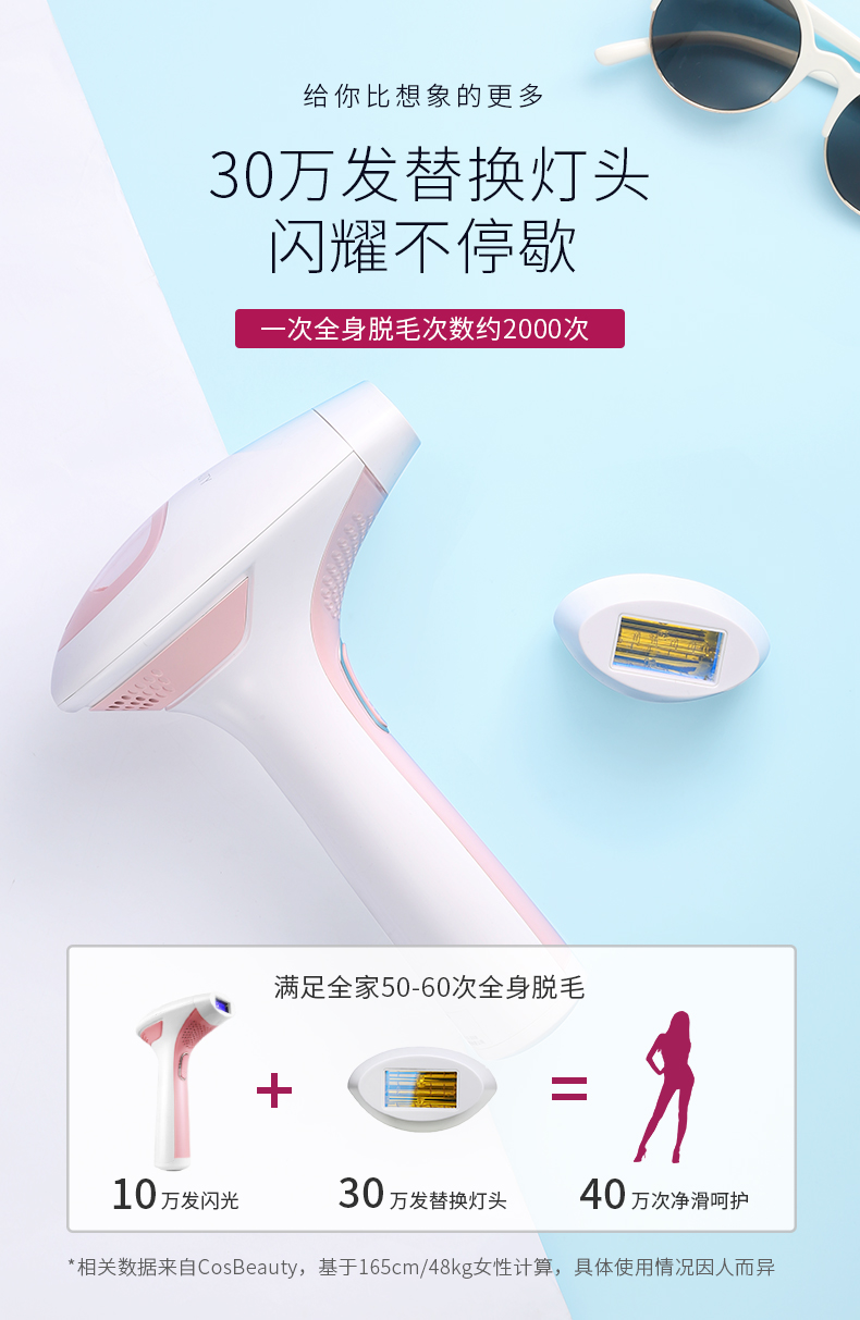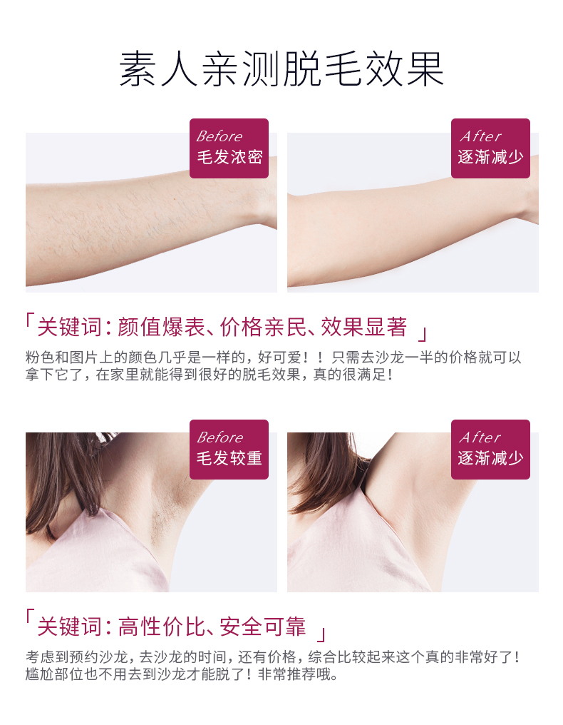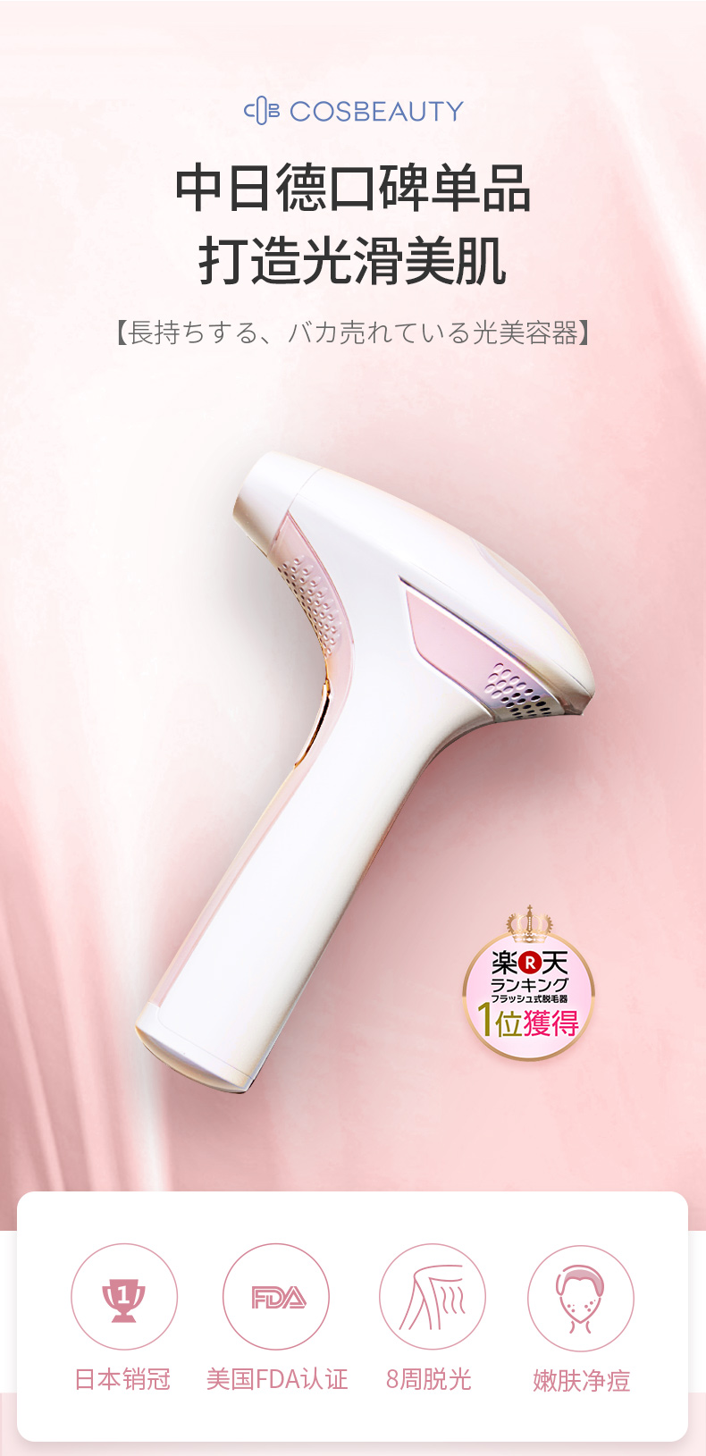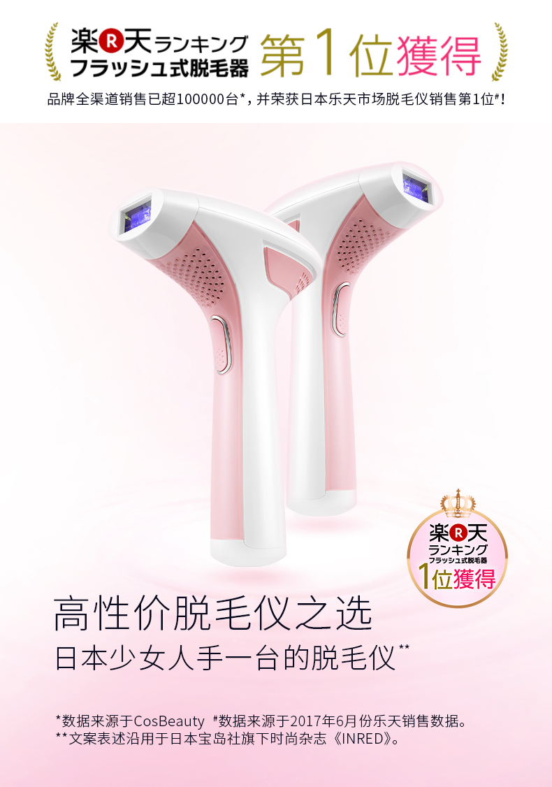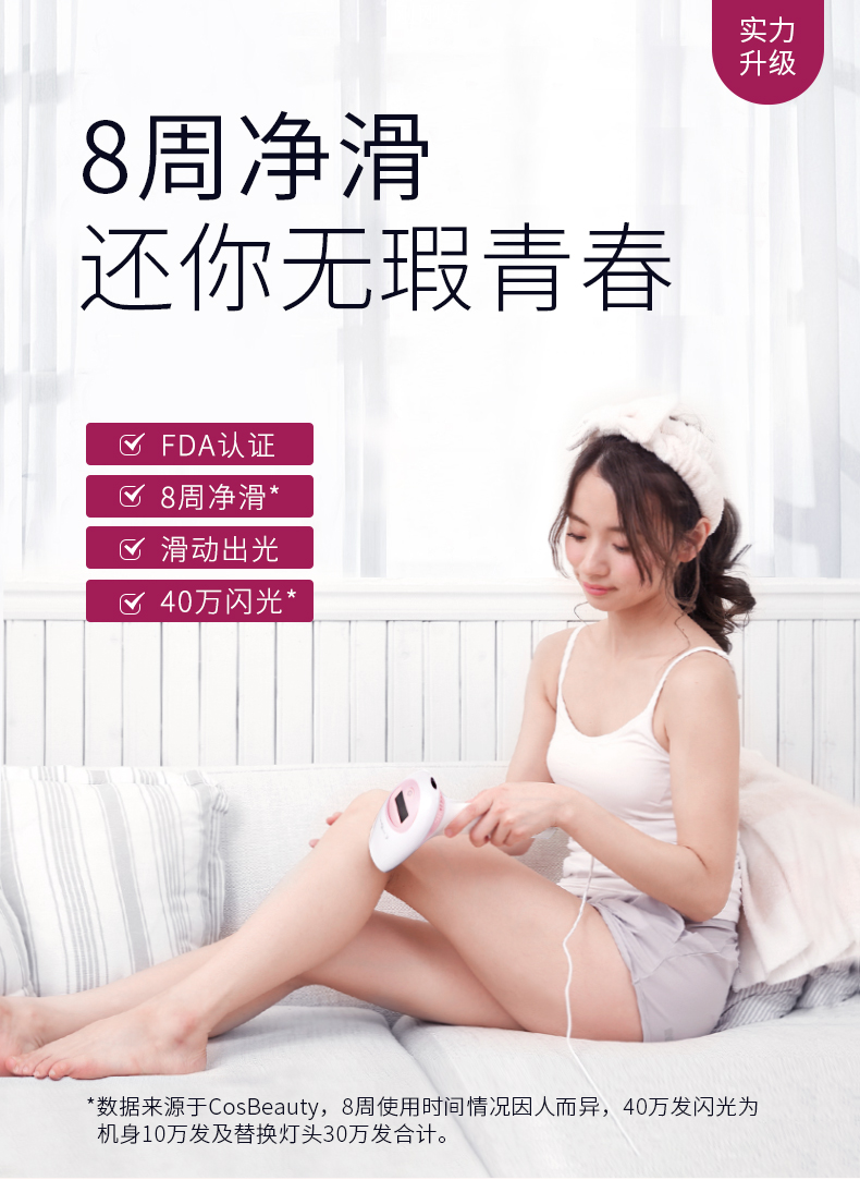 日本乐天销量冠军,8周光滑皮肤,美国FDA认证达到医疗器械的安全级别,全身(包括比基尼私密部位)可用。去美容院脱毛没个几千下不来。