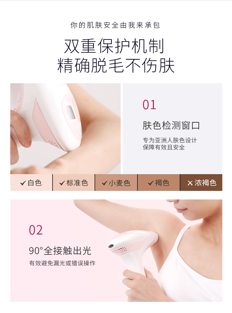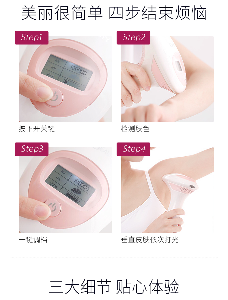 脱毛、嫩肤、祛痘3种可更换灯盒,集脱毛美体、祛痘净肤、祛斑嫩肤多重功效于一体,高性价比超乎你的预料。非侵入性纯物理技术,无刺激性,无任何不良反应和副作用,使用安全无疼痛,拥有欧盟CE安全保护认证。