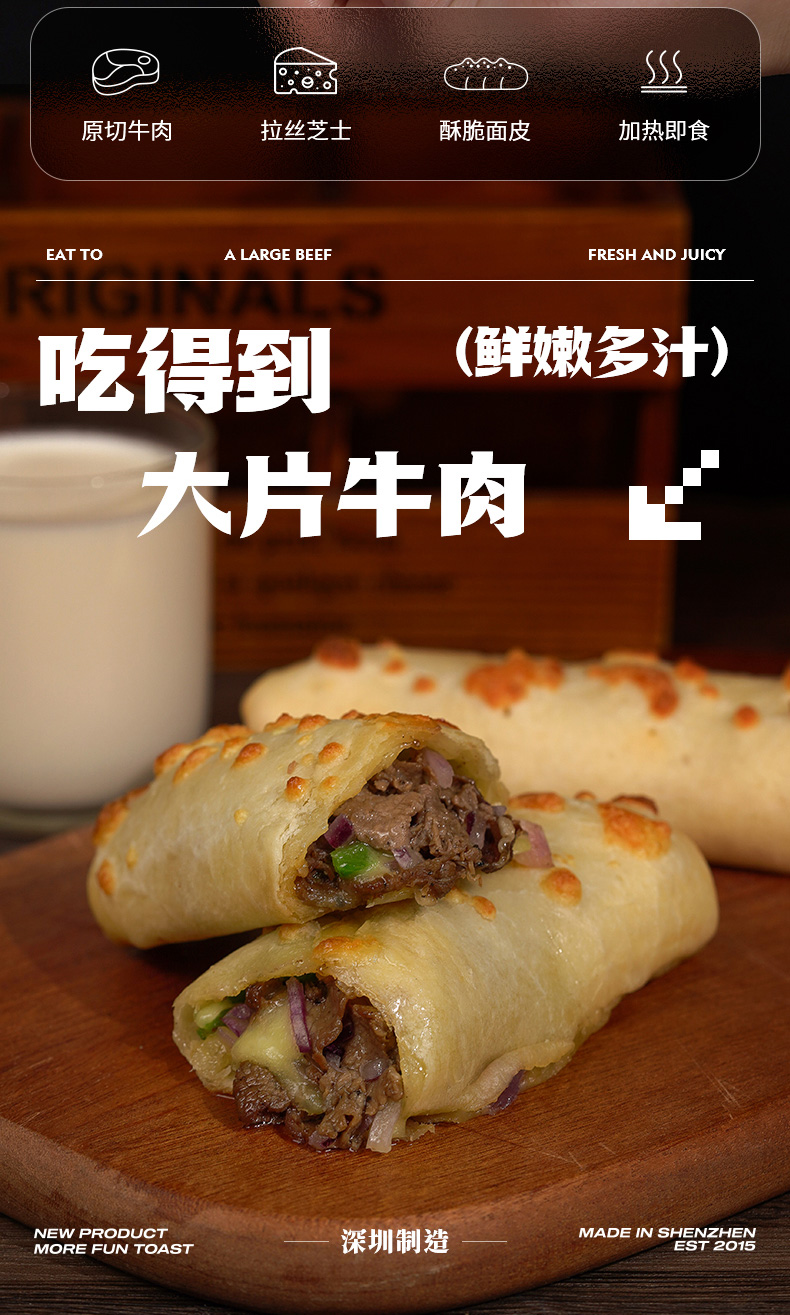 这款时刻陪你 拉丝芝士牛肉卷,规格:120g*6根,采用原切谷饲牛肉、安佳芝士,新鲜青椒、紫皮洋葱,酥脆面皮等手工现作,皮薄馅多,加热即食;麦香柔韧有嚼劲,层层酥脆,会拉丝的芝士,一口满足。