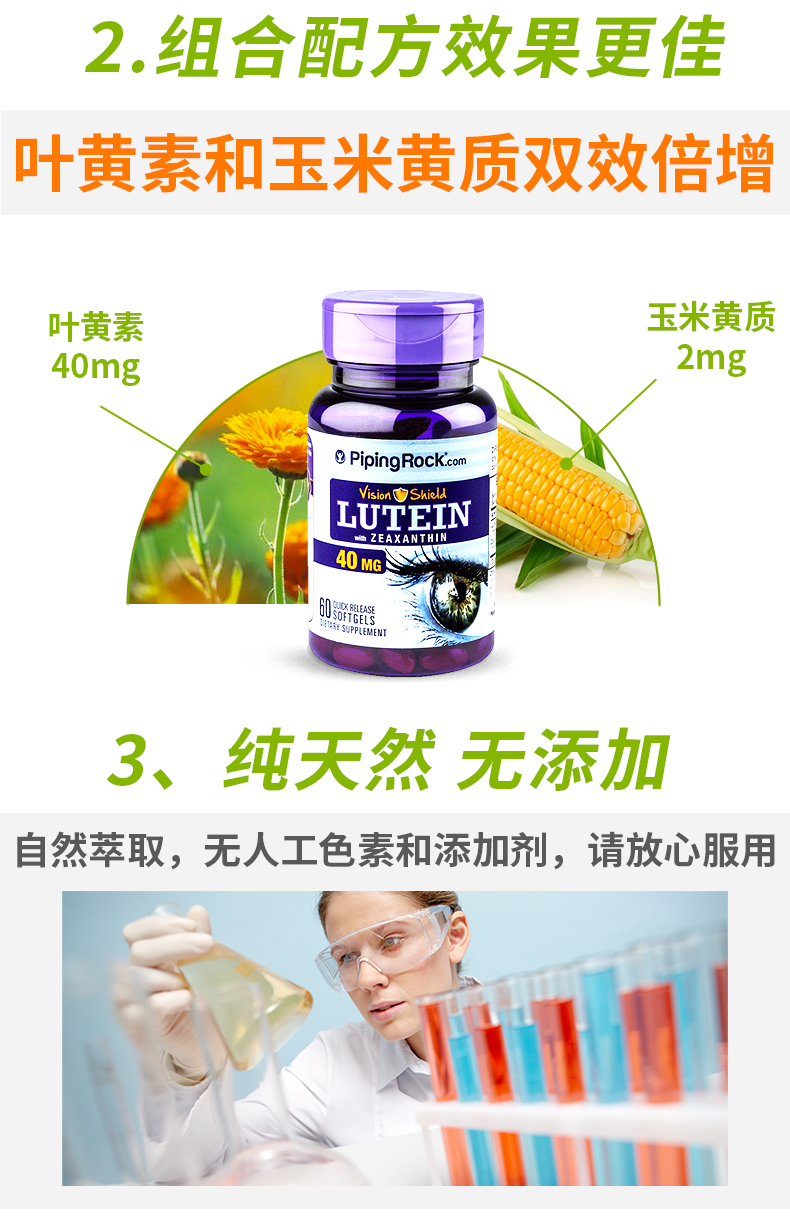 PipingRock与大众熟知的自然之宝、普丽普莱等保健品品牌同属于全球最大的膳食补剂生产商和销售商NBTY旗下,品质可靠。 高含量叶黄素,预防近视弱视,有效缓解眼睛干涩和疲劳,对干眼症疲劳酸胀流泪、红血丝黄斑飞蚊症有很好的效果,儿童成人皆可用。