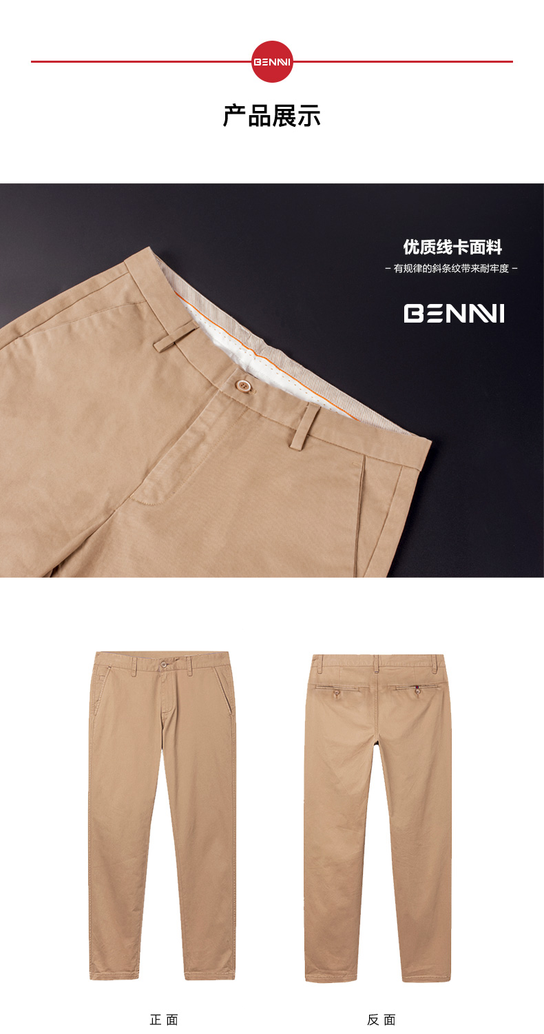 本米男士休闲裤,面料是斜纹线卡面料,以97%棉混3%氨纶弹力纤维,带有微弹力,穿着无拘束舒适度比较好。整体直筒版型,在小腿处略收紧,瞬间拉长腿部线条。除了左右裤袋,后身也有口袋。风格介于正装和休闲之间,面料厚度中等,四季可穿。
