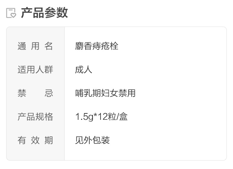 马应龙 麝香痔疮栓,主要成分是人工麝香、珍珠、冰片、炉甘石粉、三七、五倍子、人工牛黄,具有清热解毒、消肿止痛、止痒止血、润肠通便的功效。家中可以备着一些,防止哪天夜里犯了,措手不及。
