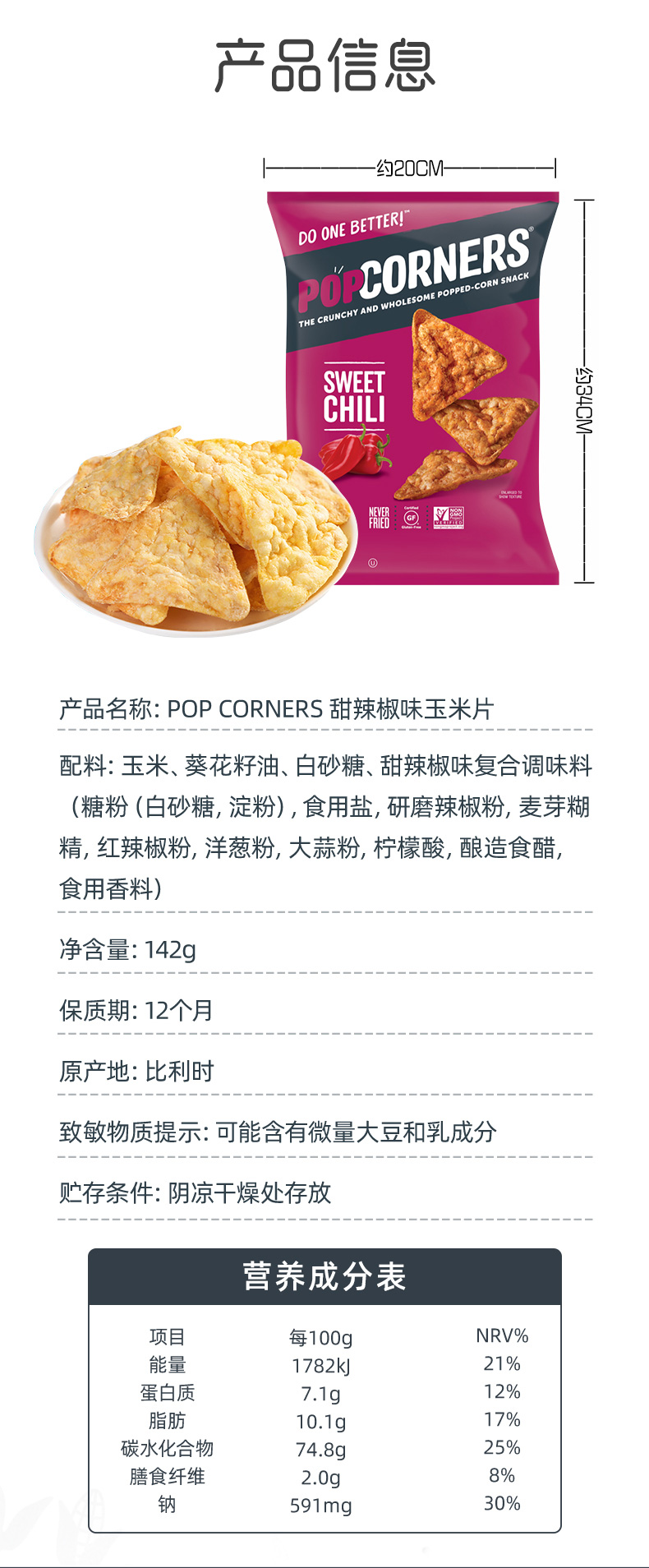 这款Popcorners 香甜非油炸玉米片,比利时进口,选用非转基因玉米为原料,低温烘焙而成非油炸,无其他添加剂成分,口干松脆,好吃更健康。