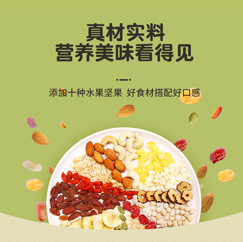 这款优佳 即食混合谷物坚果脆麦片,水果谷物搭配配方,使用非膨化麦片为主料,富含膳食纤维易饱腹,搭配腰果、枸杞、香蕉片、玉米片、烤椰片、葡萄干、冻干草莓、蔓越莓干、红枣、南瓜籽仁、巴旦木,不额外添加蔗糖,营养均衡,不含人工添加剂,适合健身代餐。
