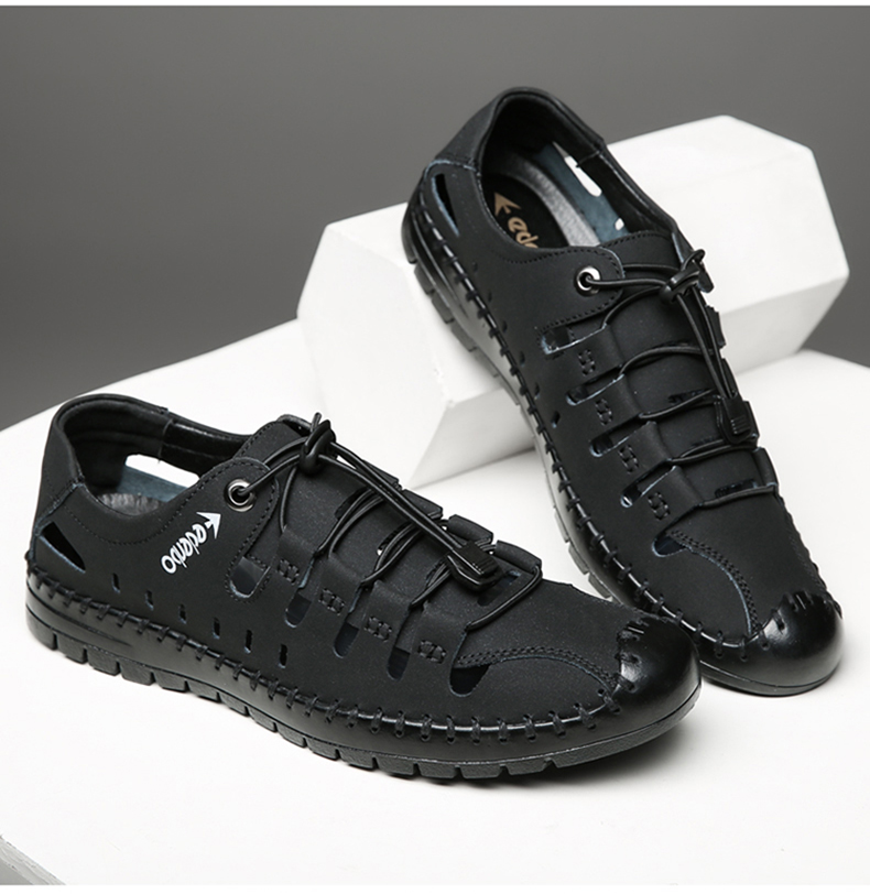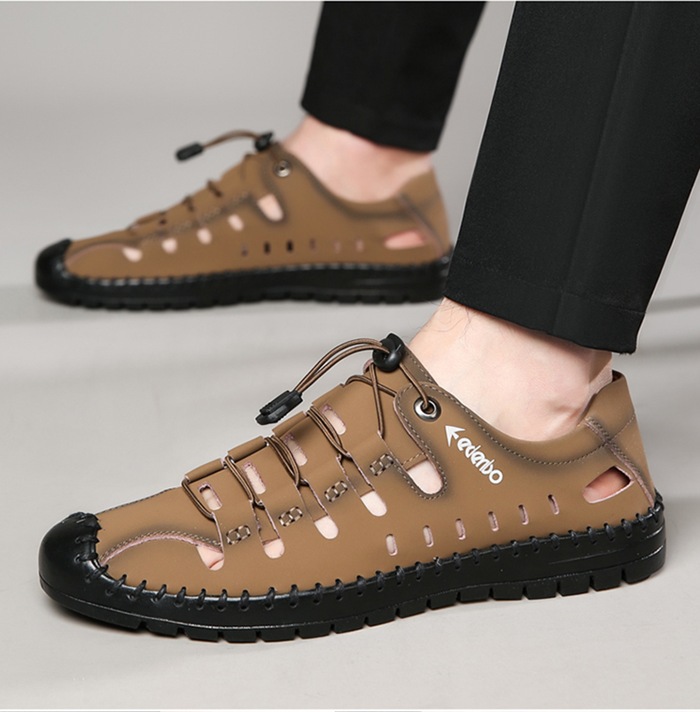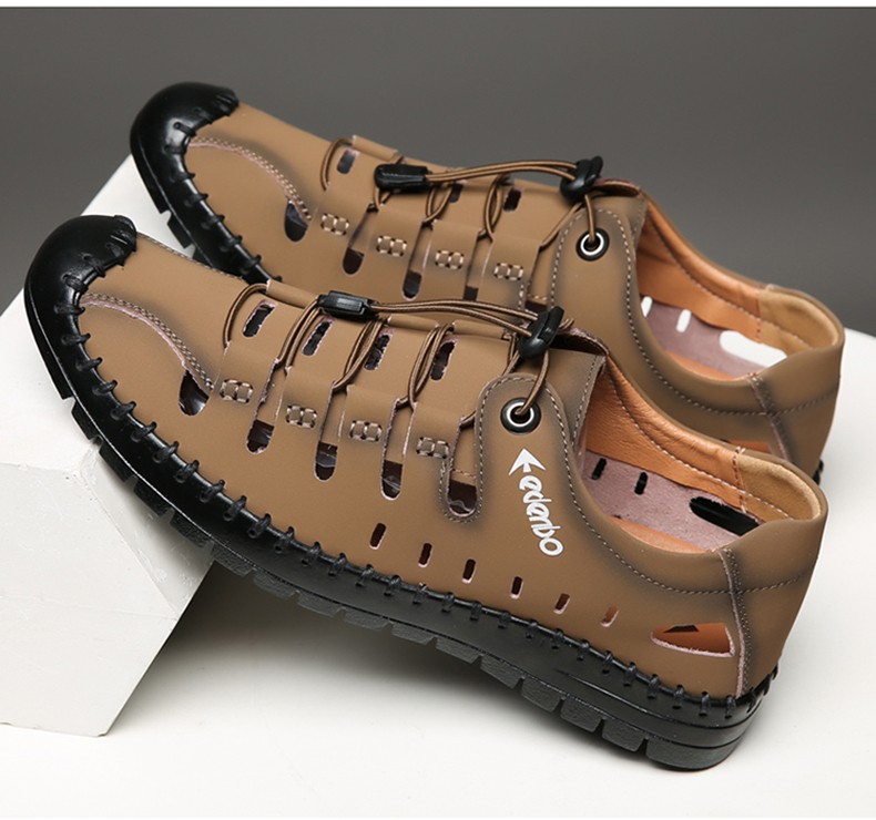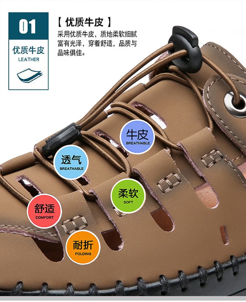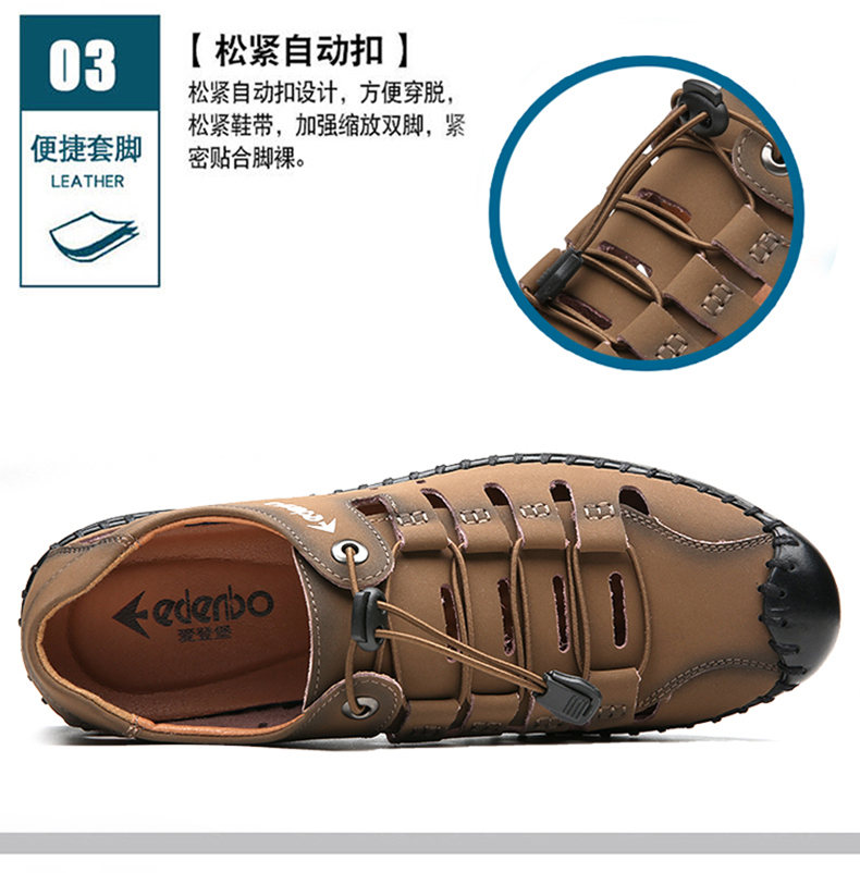 这款皮凉鞋,采用优质牛皮材质,质地细腻,柔软富有光泽,时尚洞洞设计,鞋面、鞋底手工缝线,更加牢固美观,海边涉水减少脱胶概率,松紧鞋带自动扣设计,包裹性好穿脱方便,橡胶大底,耐磨防滑,整体轻便,日常休闲、旅行穿着轻松舒适。