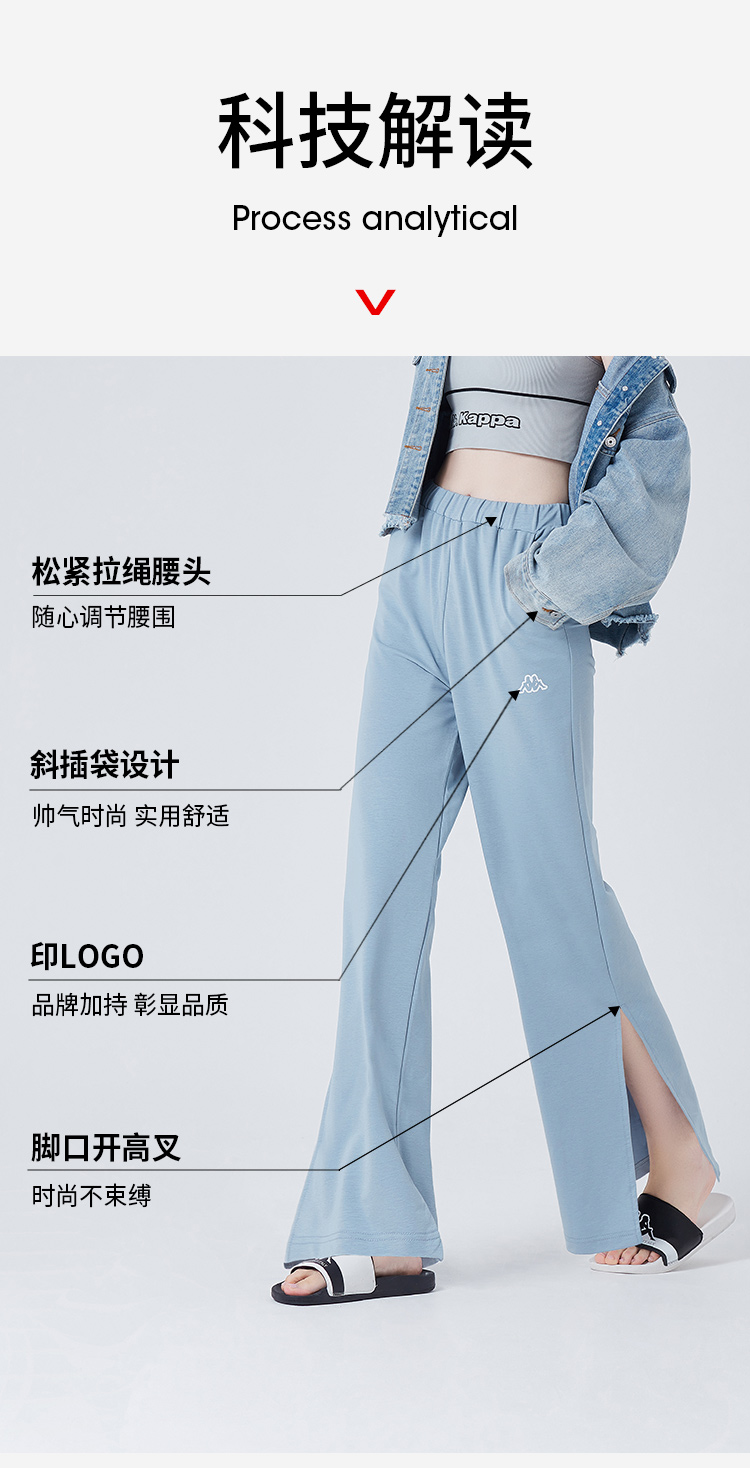 这款Kappa 卡帕 女高腰直筒开叉阔腿裤,选用40/20精棉斜纹,防静电,柔软舒适;松紧拉绳腰头,随收调节腰围;斜插袋设计,帅气时尚,实用舒适;品牌LOGO,彰显品质;脚口开高叉,时尚不束缚。