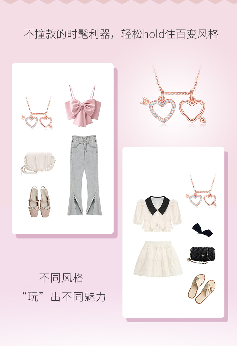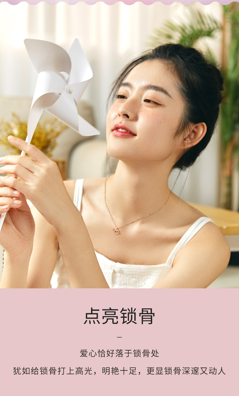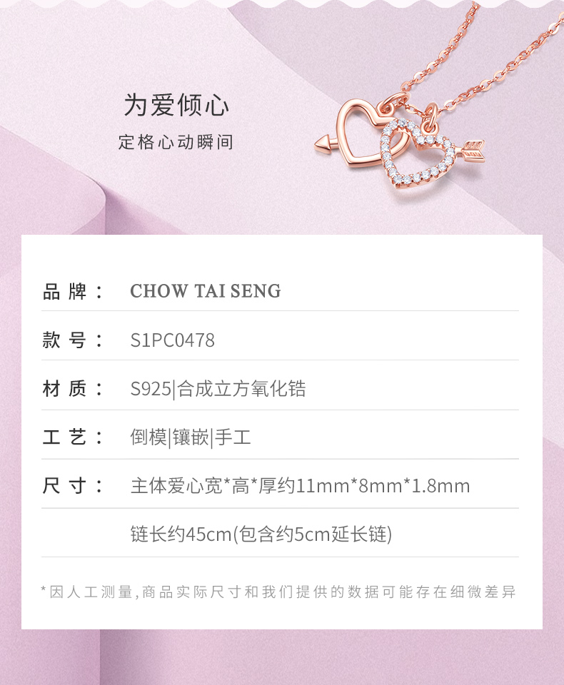 这款Chow Tai Seng 周大生 S925银锁骨链心动时刻双心套链,独特设计,两颗爱心既可以相互独立,又可以合二为一,随心切换,魅力百变;爱心恰好落于锁骨处,犹如给锁骨打上高光,明艳十足,更显锁骨深邃又动人;爱心上满镶锆石,充满少女气息,璀璨闪耀,时尚点缀,清新可人,甜度满分。