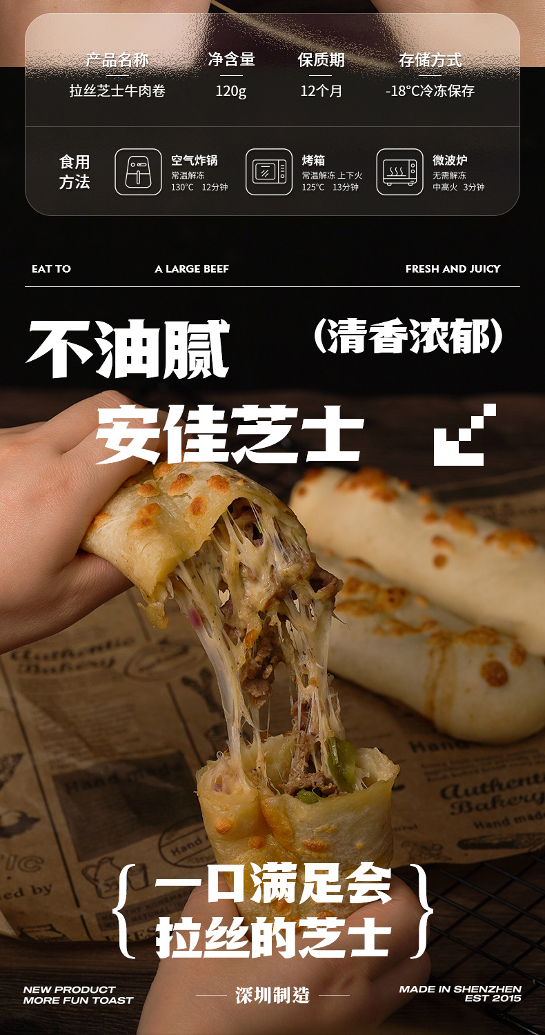 这款时刻陪你 拉丝芝士牛肉卷,规格:120g*6根,采用原切谷饲牛肉、安佳芝士,新鲜青椒、紫皮洋葱,酥脆面皮等手工现作,皮薄馅多,加热即食;麦香柔韧有嚼劲,层层酥脆,会拉丝的芝士,一口满足。