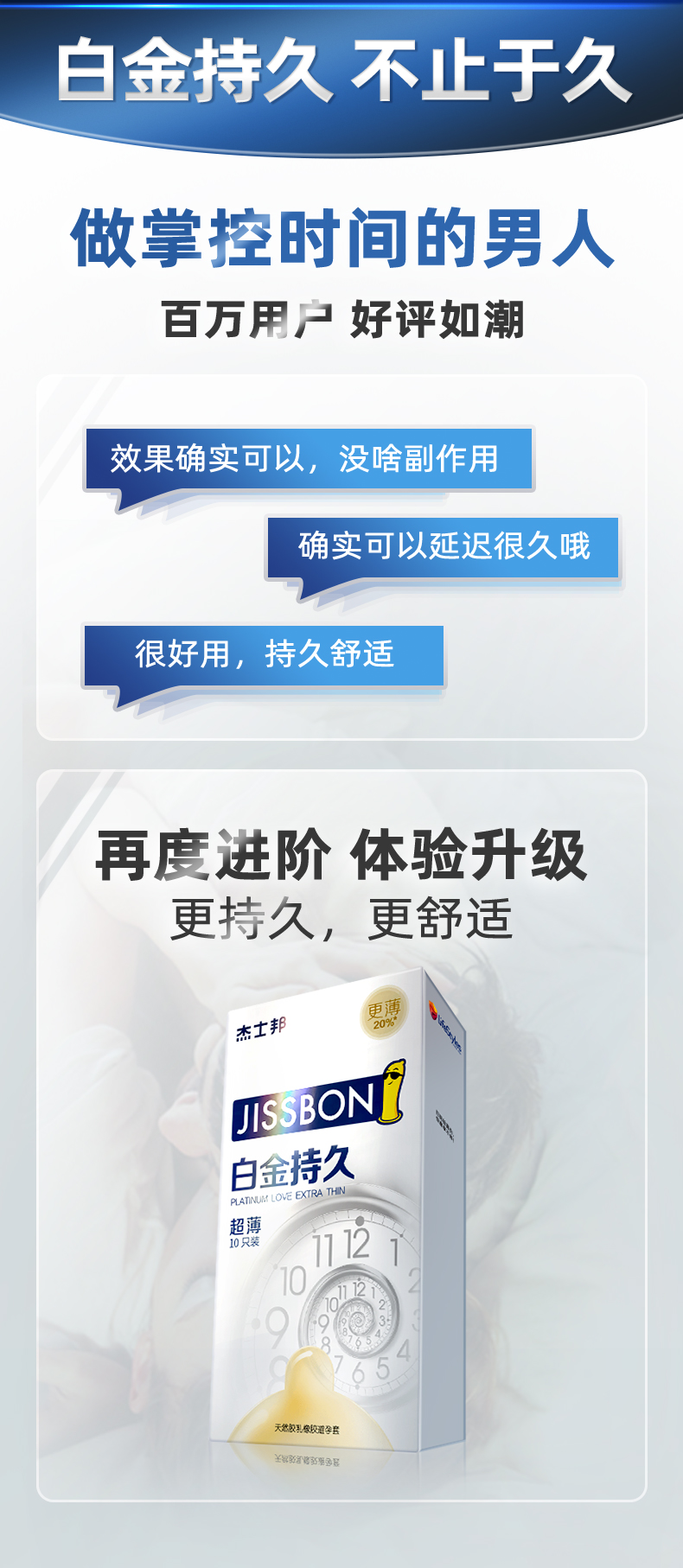白金持久是 杰士邦持久系列的超薄款,也是口碑销量榜首,与黄金持久都是添加的9mg液态苯佐卡因,快速吸收、高效延时,集中于套套前端,局部降敏不影响整体快感。薄度上白金持久更具有优势,相比黄金持久要更薄20%,体感效果更棒。