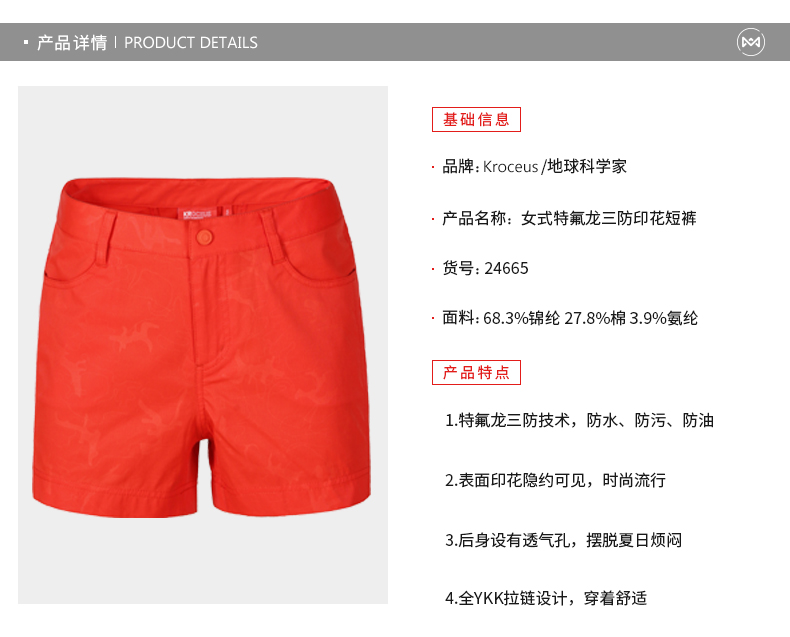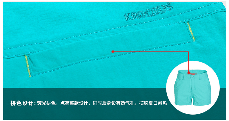 这款短裤使用轻薄透气的防泼水速干面料,成份为94.8%锦纶以增加耐久和速干,5.2%氨纶具有适度的微弹力。这条裤子在细节上,后身腰位置设有隐藏式网眼透气孔,前档门襟使用日本YKK拉链,版型上立体裁剪,男五分/女短裤。