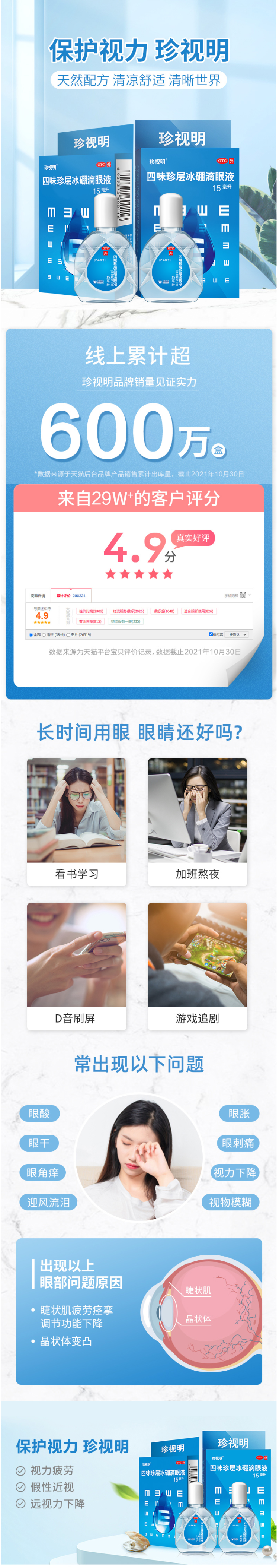 珍视明滴眼液,主要用于日常护眼,缓解眼疲劳、干涩胀痛、预防青少年假性近视,尤其适合长久盯着屏幕的上班族,用于肝阴不足、肝气偏盛所致的视力下降等。