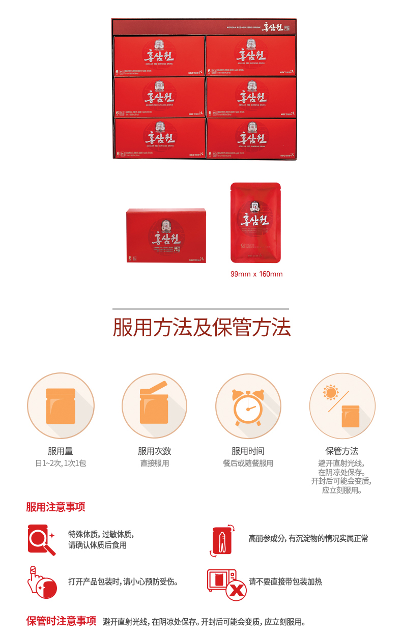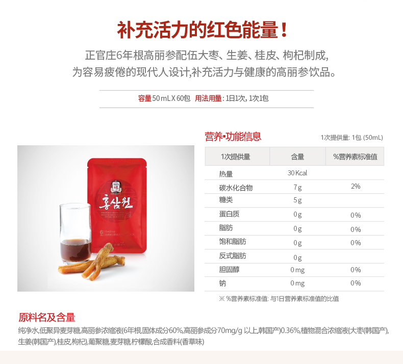 这款正官庄牌 高丽参红参液,采用6年根高丽参,富含32种皂苷,搭配生姜、大枣、肉桂、枸杞,增强体质,特别适合熬夜党,手机电脑党,抵抗力低的人群。一日一次,一次一瓶。