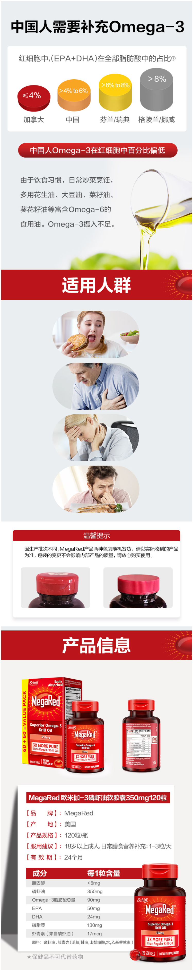 Schiff的MegaRed Omega-3深海磷虾油胶囊,主要作用是疏通血管、强力调节三高、降低心血管问题发生率,规格是350mg*120粒,每日1-3粒随餐服用,适合成人和老人服用,未成年人、孕妇和对海鲜过敏者忌服。