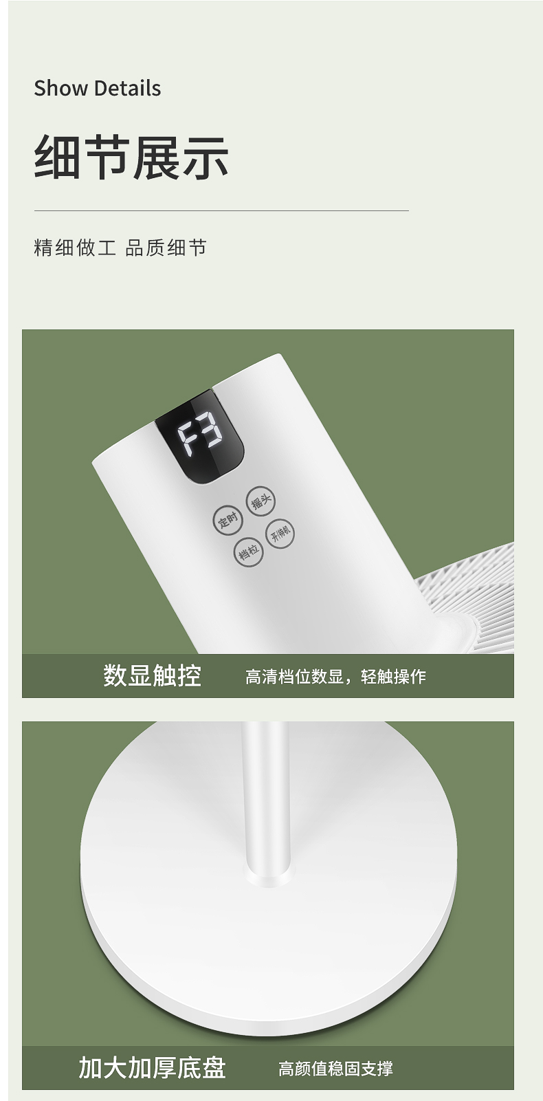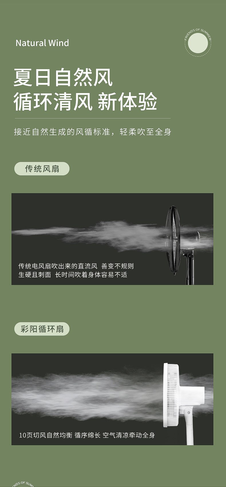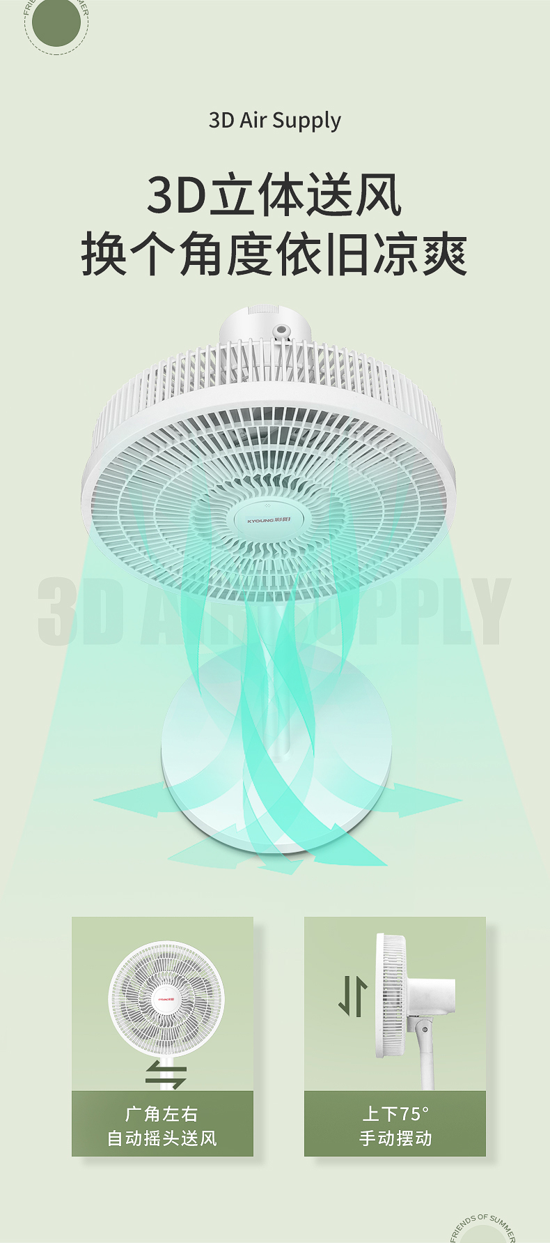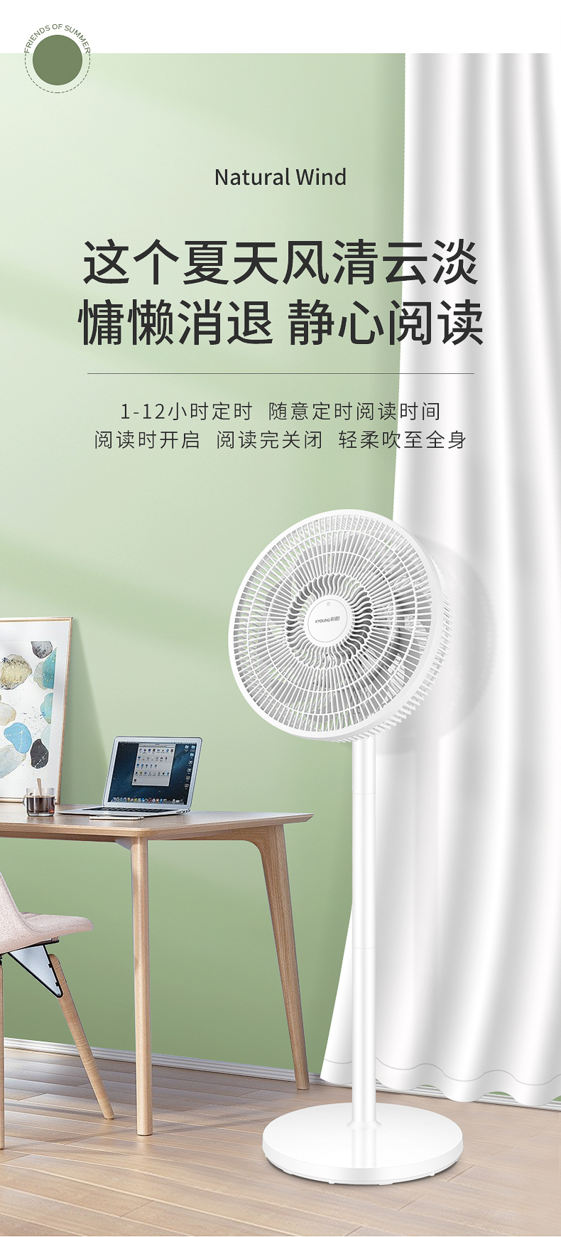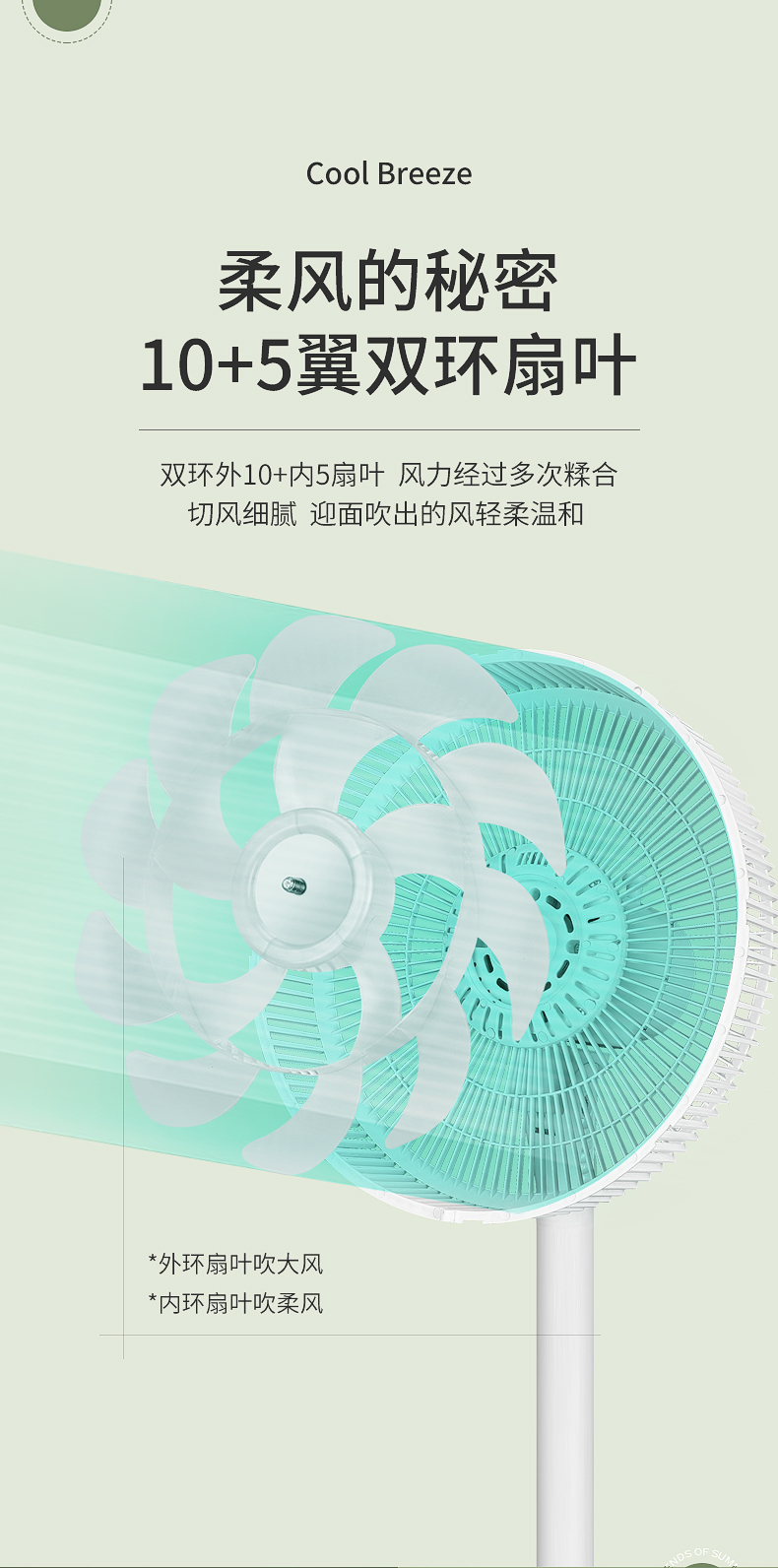 专利15叶双环扇叶,扇叶均匀切割密集风体,模拟自然风,出风更柔和、细腻、均匀。没有传统风扇的生硬、刺面感,长时间吹也不会不适,更适合儿童、老人等敏感人群。