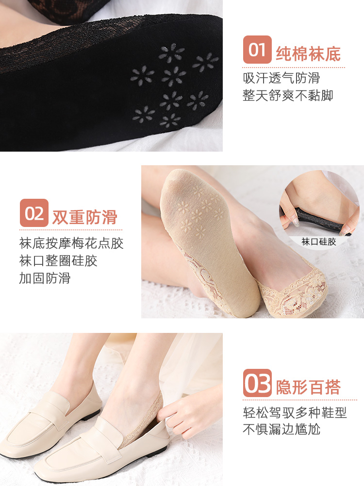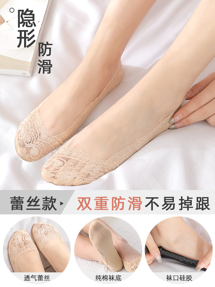 这款浪莎 春夏女士蕾丝船袜,浅口袜口设计,整圈硅胶,舒适穿着不脱落实,轻松隐形,无露出袜子的尴尬,四季随心搭配。