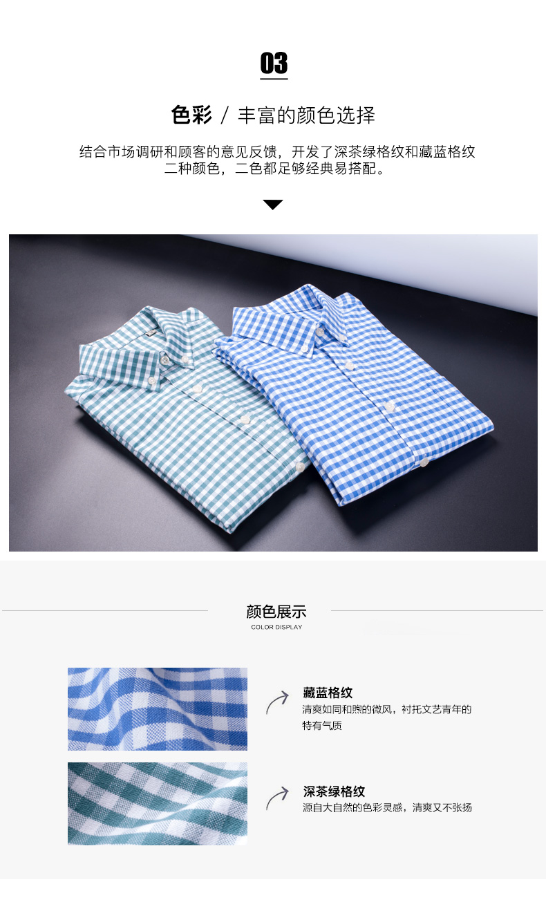 本米牛津纺衬衫,面料选用100%新疆长绒棉,自然柔软亲肤。牛津纺不是面料,而是指特定织法形成的一种面料风格,牛津纺质地粗疏自然,休闲感十足,做成格纹的样式,非常显年轻,比精梳面料更适合非正式场合。