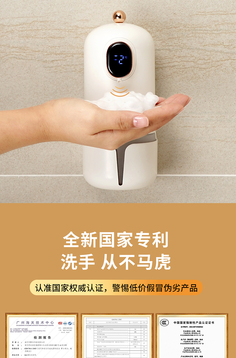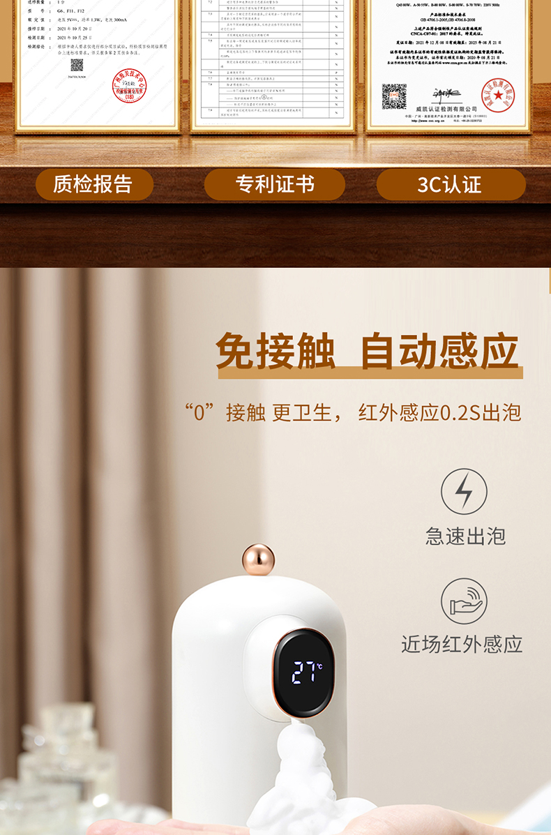 洗手黑科技,免接触,疾速感应出泡,防止细菌交叉感染,洗手0负担。泡泡浓度清洁,双重保湿成分,深层洁肤,滋润亲肤。